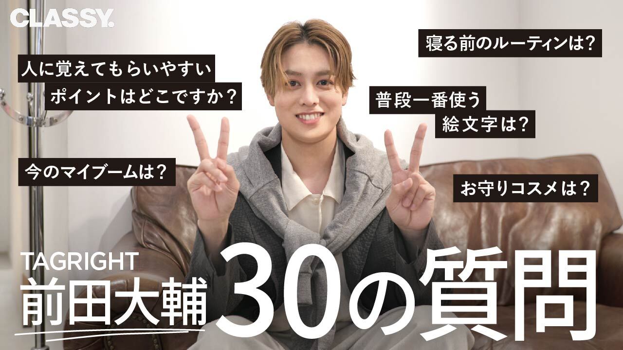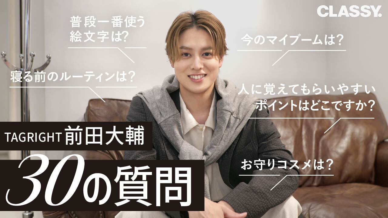 CLASSY.Channelの最新公開動画では、今話題のボーイズグループTAGRIGHTの前田大輔さんが登場。CLASSY.4月号の「退勤後デートありきの通勤服」企画では、普段とはまた一味違う「仕事終わりの服」姿で登場! 今回はそのスピンオフとして30の質問に答えていただきました。