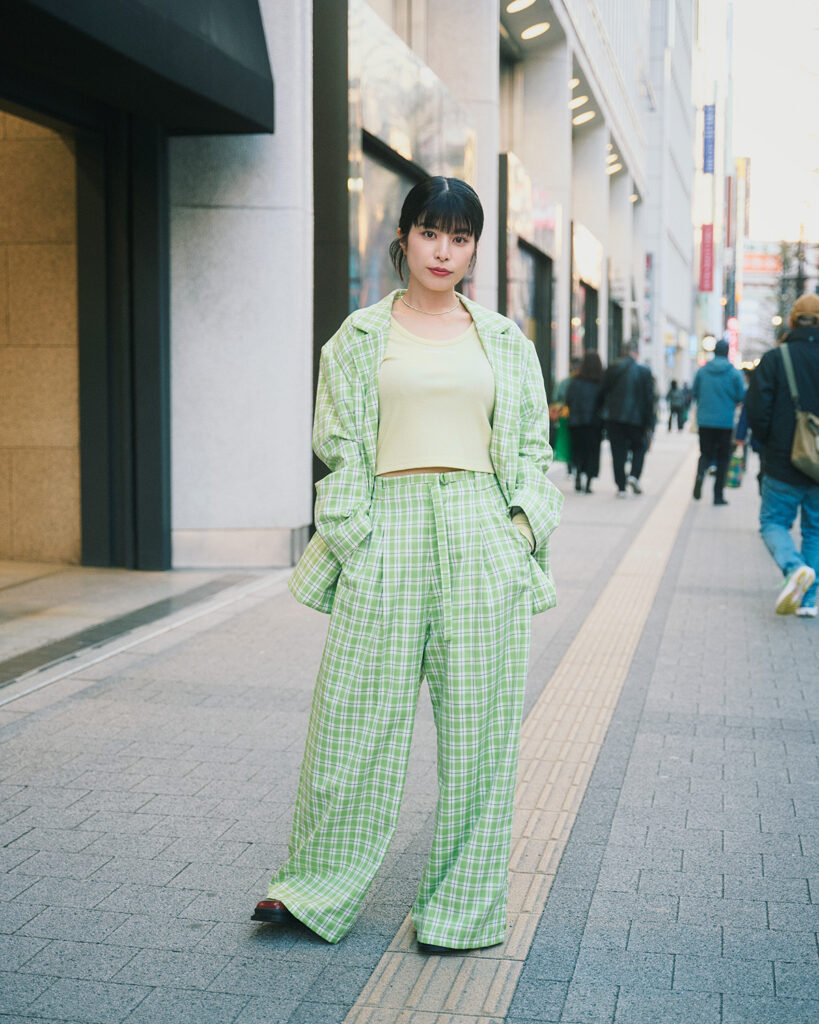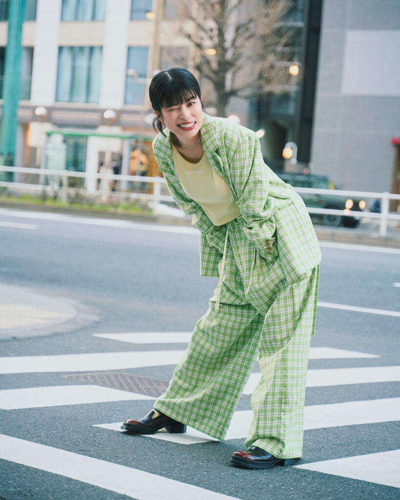 ジャケット¥33,000パンツ¥24,200(ともにMAISON SPECIAL/MAISON SPECIAL AOYAMA)トップス¥5,500(MURUA)シューズ¥30,800(Dr.Martens)