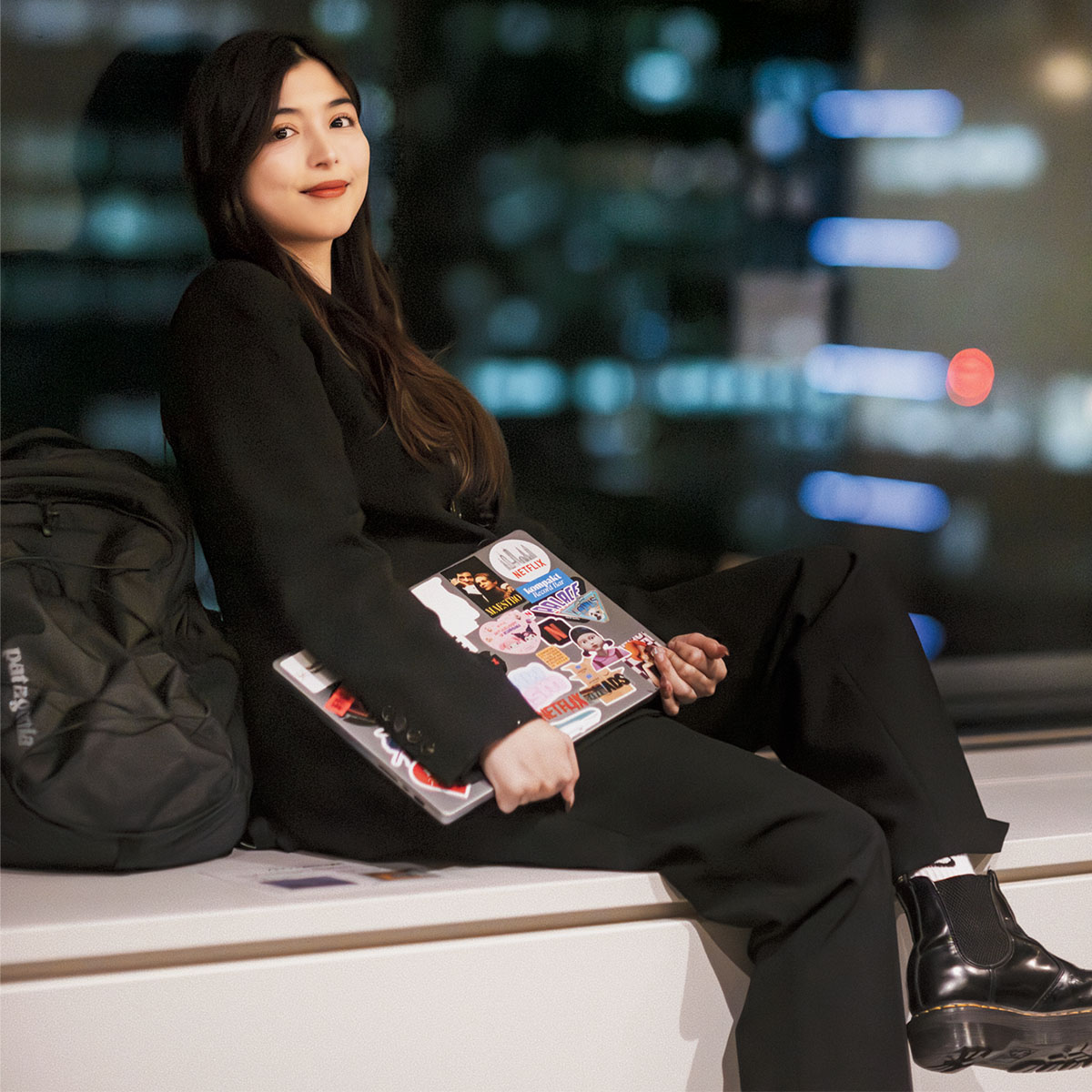 2025年に転職、広告営業として2年目に突入。前職に比べて、外部の方と接触する頻度が高く、国内のお客様への向き合いがメイン。社を代表して“一人フロント”を務めることもあり、ジャケットやセットアップのきちんとスタイルが定着しました。以前よりも“キレイめ”が求められますが、「今日はジャケットを着る」と決めてしまえば、自分的にも楽。制服のように黒Tに黒ジャケットを羽織ればコーデが出来上がるから、朝の準備時間も短縮化。仕事自体も効率的に進められるようになり、年始には2週間程休みを取ってカナダへも。