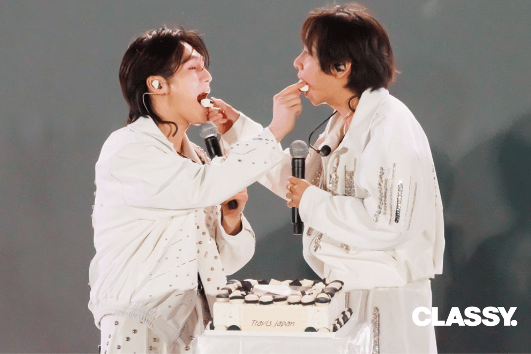 その後フォトセッションが行われ、メディア向けの撮影に加え、集まったファンとの記念撮影も。ファンが撮影のために一斉にしゃがんで協力する姿に、松倉さんが「みんな(一斉に消えて)怖いよ!(笑)」と冗談を飛ばしたり、宮近さんが「今、声撮ってないから、呼びかけて大丈夫だよ」との声掛けにファンが「おめでとう!」などと応えます。セルカ棒付きのスマホを持ってきた松倉さんは、スマホ画面に手を伸ばしてシャッターボタンをタッチ。松田「自撮り棒の意味ねえ(笑)指で押してる(笑)」とツッコみ、Travis Japanらしい自由で温かい時間が流れます。