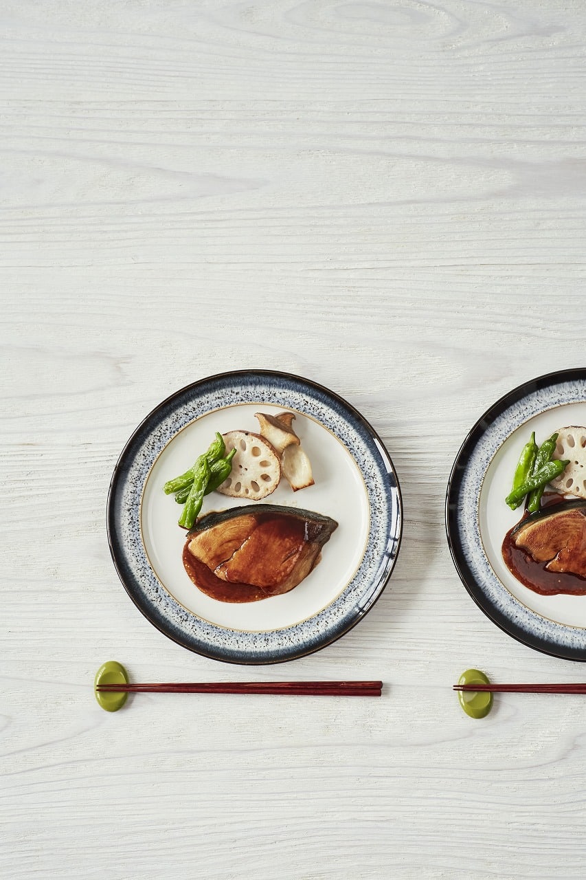 4.野菜に火が通ったら取り出してお皿に盛り付ける。残っているたれを加えて 少しとろみがつくまでぶりに煮からめながら焼いて盛り付け、たれをかける。