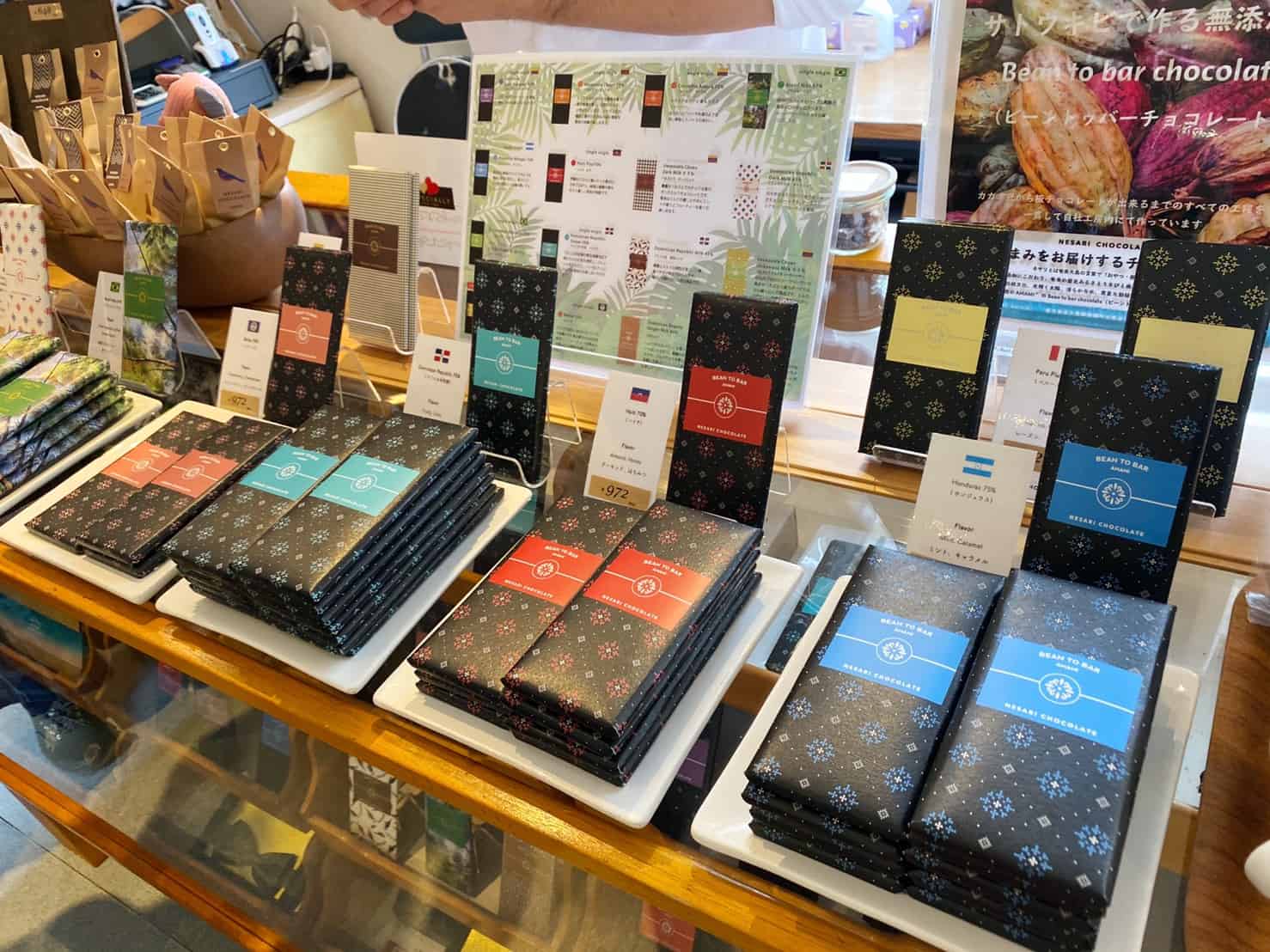 大島紬村のショップ内にあるチョコレート専門店「ネサリチョコレート」 では、奄美大島の光輝く太陽の下で育ったさとうきびでつくる無添加のBean to bar チョコレート が販売されています。チョコラバーな筆者としてはとても嬉しい本格派!カカオやフレーバーの種類も豊富にありました。