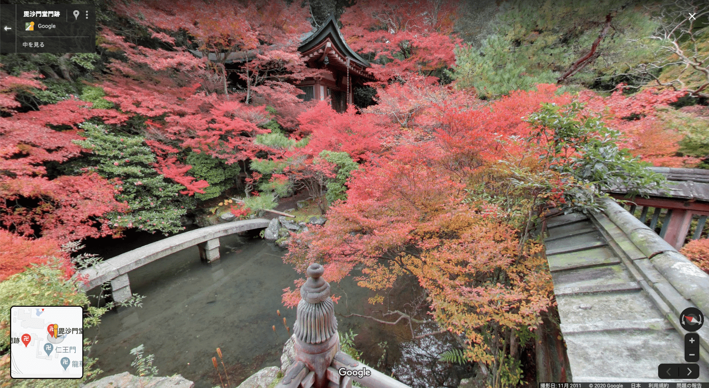 京都の中心観光地から少し山奥に行ったところにある、「毘沙門堂」。秋になるとお堂に続く道が真っ赤な紅葉の絨毯に敷き詰められ、異世界に迷い込んだ気分にしてくれる絶景スポットです。私がおすすめする見所は、お堂の奥に構える「晩翠園(ばんすいえん)」。Googleストリートビューではこの庭園を覗くことができ、紅葉に色づく秋の晩翠園の絶景美を崇めることができるんです!通常は人が多く混雑していますが、ストリートビューなら順番を譲る必要なくゆっくり見られるのも嬉しいですね。