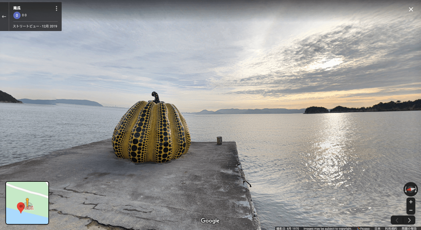 アートの島として名高い、香川県の直島。島が丸ごとアート作品の展示場となっており、島の各所に点在する作品巡りが楽しい島です。実際も自転車で巡ることができるほどの小さめの島なのですが、Googleストリートビューなら一気に作品巡りができるのでおすすめ!ちなみに自転車を漕ぎながら見える島からの絶景も素敵な場所なので、アート巡りをしながら島の絶景も楽しんでみてくださいね。