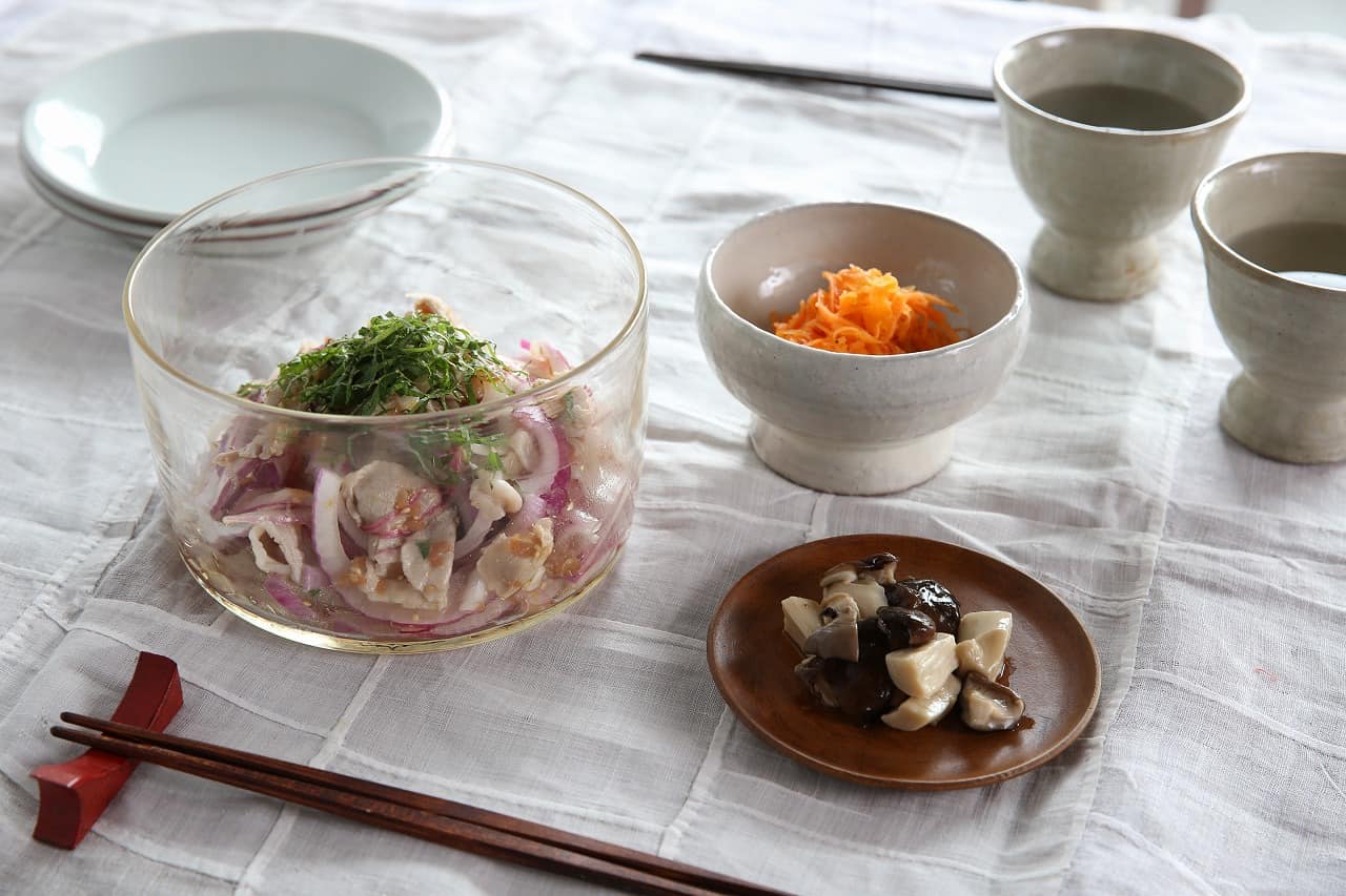 縁が真っ直ぐに立ち上がったガラスのどら鉢は、石川硝子工藝舎のもの。料理家・下条美緒さんレシピによる冷製豚しゃぶを盛ると、側面からも彩りが見えてテーブルが華やぐ。松江の出張料理家、太田夏来さんのキノコ塩蒸しをのせたのは松本かおるさんの小皿。原洋一さんの白い器と組合わせても重たさを感じずに、アクセントになる。