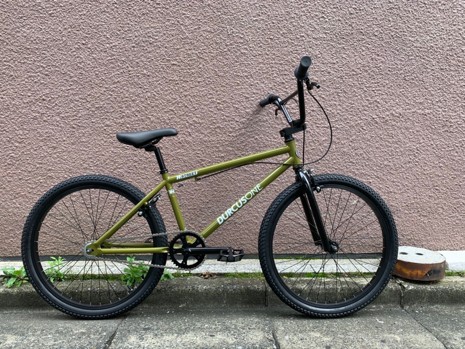 シンプルなフレームでスマートな24インチのBMXは、メンズや渋谷周辺のショップスタッフたちにも人気のモデル。レアなカーキはどんな色の服とも相性がよく、コーデを選ばずオシャレ見えするカラー。握りやすいストレートハンドル。「DURCUS ONE “H-STREET” CP」¥55,000(税込)