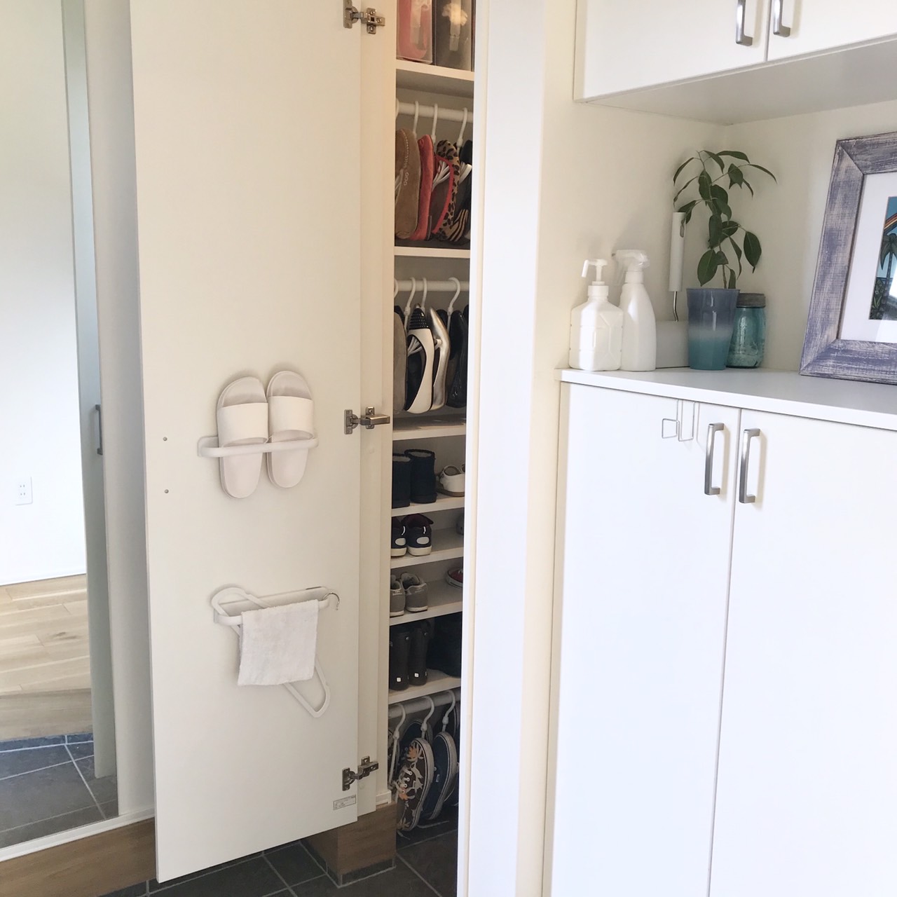 少しでも玄関を広く見せたい!掃除をラクにしたい!と思って、玄関用のサンダルを空中収納。白い扉には白いグッズを、黒い扉には黒いグッズを選んで同化させるのも私のこだわり。収納グッズは目立たせないように空間に馴染ませています。 この空間収納アイテムは、簡単に作れるのもポイントで、ダイソーのタオル掛けを、磁石用ステンレス補助プレートを使って扉に貼り付けるだけで完成。費用はたったの220円(税込み)。サンダルは無印良品です。