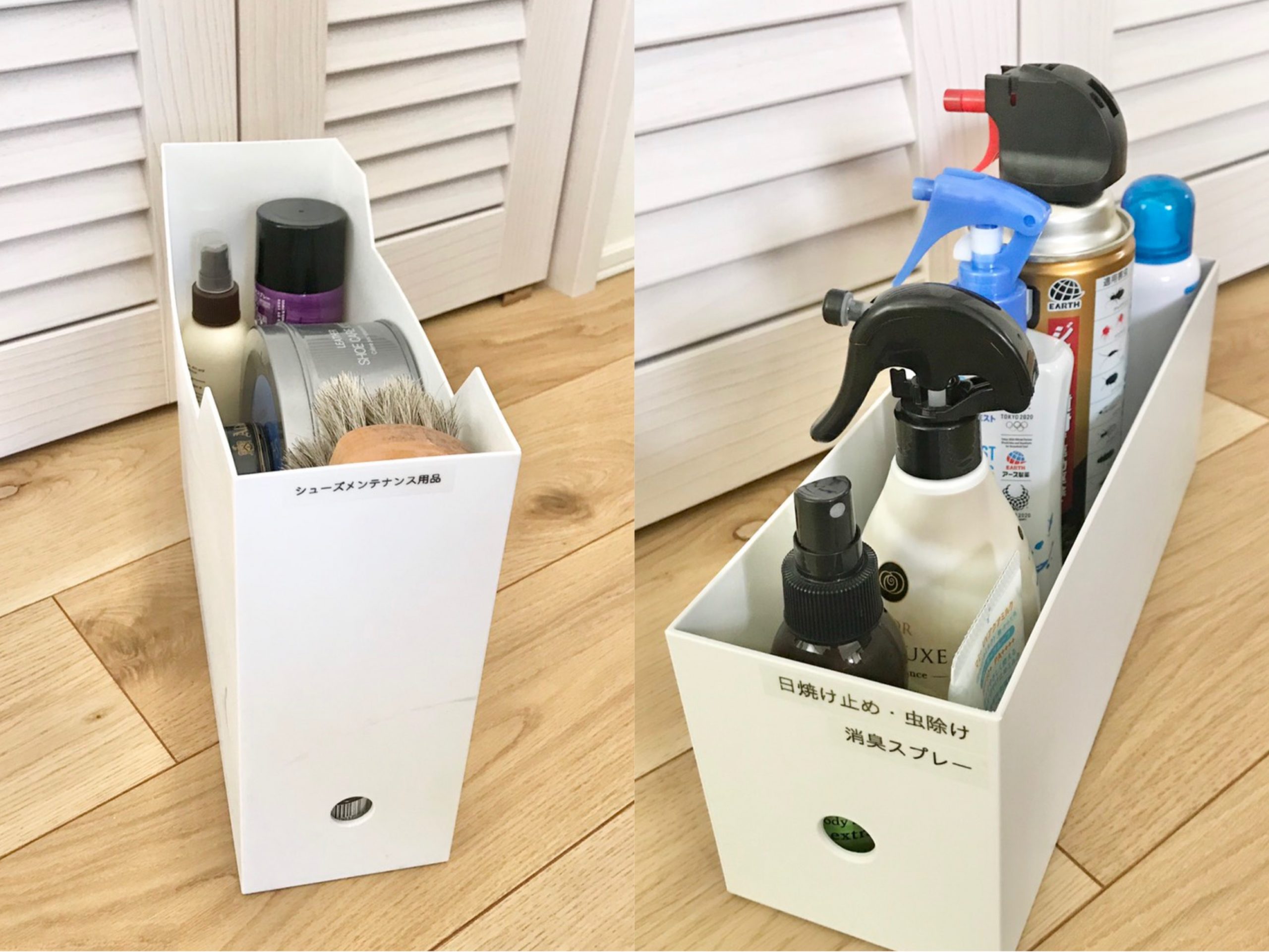 シューズ用のメンテナンスグッズや、虫除けスプレー、消臭剤など玄関周りに置いておくと便利だけど、見た目がチョット•••という物、結構ありますよね!? 私はニトリのファイルボックスに収納して、シューズクローゼットの下段に置いています。お客さん用のスリッパもファイルボックスに入れて、玄関には極力物を置かないように。
