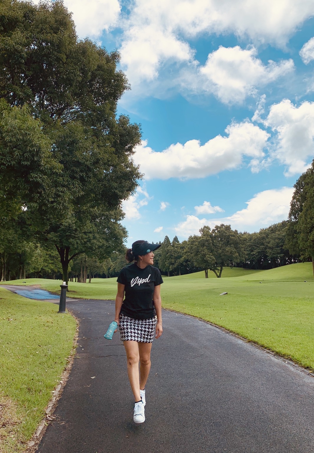 トレンドとして注目されているモックネックのロゴトップスに初トライ。「ラウドマウス」の千鳥格子柄ミニスカートを投入して、モノトーンで統一しました。重たくならないように、抜け感のある白のスパイクレスシューズで軽やかさをON。トップスとシューズは「キャロウェイアパレル」です。ターフに映える派手カラフルなウェアは、日本でゴルフをする際は卒業。大人でも恥ずかしくないきちんとネイビーや、上品見えするトラッドが気分です。最近のファッションはロング丈がトレンドで、ゴルフかリゾートでしかミニをはかないので、お久しぶりの脚出しスタイルを楽しんでいます!
