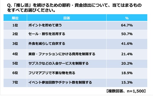 現在推し活のための貯金をしているか聞くと、全体の3割以上(35.3%)が「推し活のための貯金をしている」と回答。加えて、推しを守るための資金捻出の手段について聞くと、「節約」をしている人が62.7%、「投資」をしている人が34.5%、「副業・アルバイト」をしている人が21.6%となり、その具体的な方法では、1位から順に「ポイントを貯めて使う(64.7%)」、2位「セール・割引を活用する(50.7%)」、「外食を減らして自炊する(41.6%)」となりました。