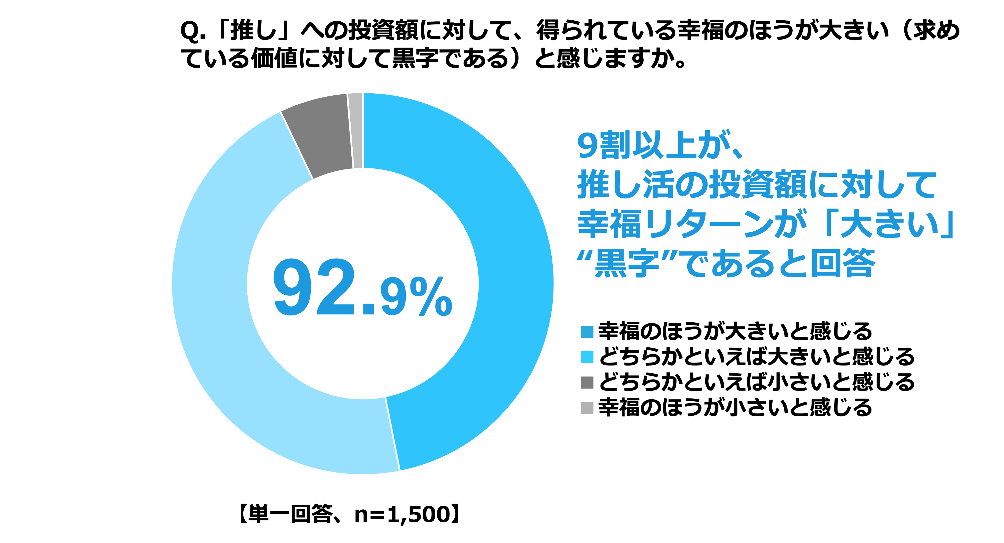 また、「公式グッズ」という、満足と不満足が共存する、ファンにとってよりシビアな投資への反応が明確になりながらも、推しへの投資額に対して得られている幸福(求めている価値に対してリターンがあるか)に関する質問では、全体の9割以上が「黒字」と考えていることがわかり、「推し活市場」が拡大し続けている要因がうかがえました。
