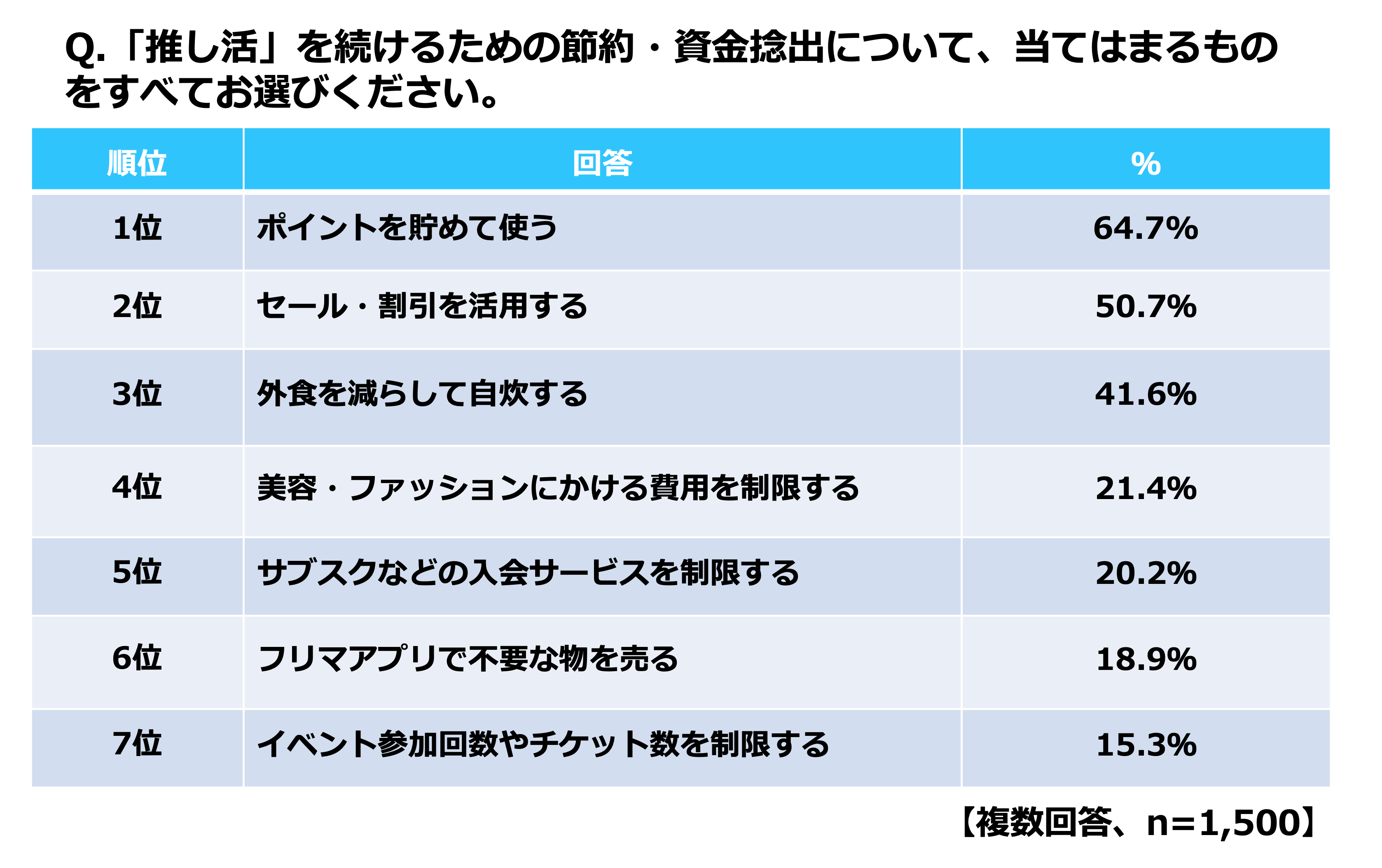 一方で、「イベント参加回数やチケット数を制限する(15.3%)」は最下位となり、最も重要な“ライブ参戦”は最後まで死守していることがわかりました。