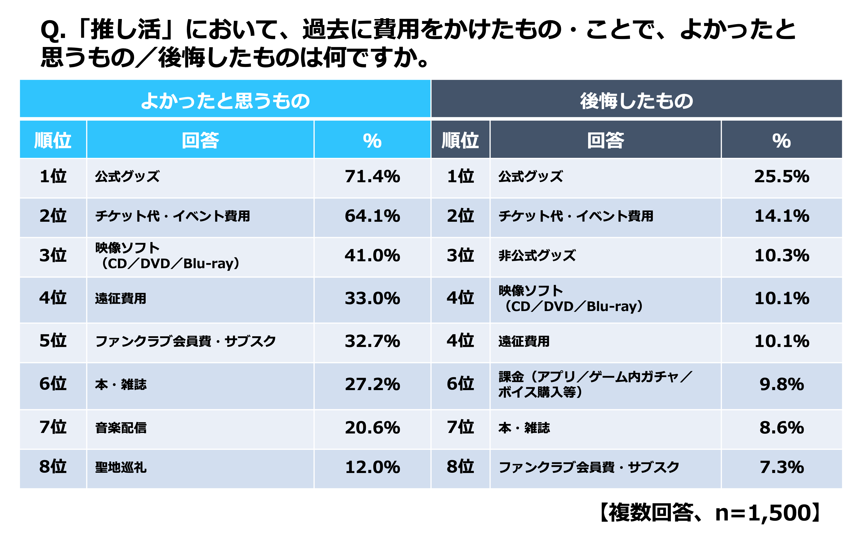 一方、後悔したものにおいても、1位「公式グッズ(25.5%)」がランクインするなど、よかったもの・後悔したもの双方のランキングで1位となり、多種多様な公式グッズも、ファンにとっての評価は内容・クオリティ次第であるというシビアな現実が浮き彫りになりました。さらに、3位に「非公式グッズ(10.3%)」がランクインし、非公式とわかっていても買ってしまうファンの複雑な心理も明らかになりました。