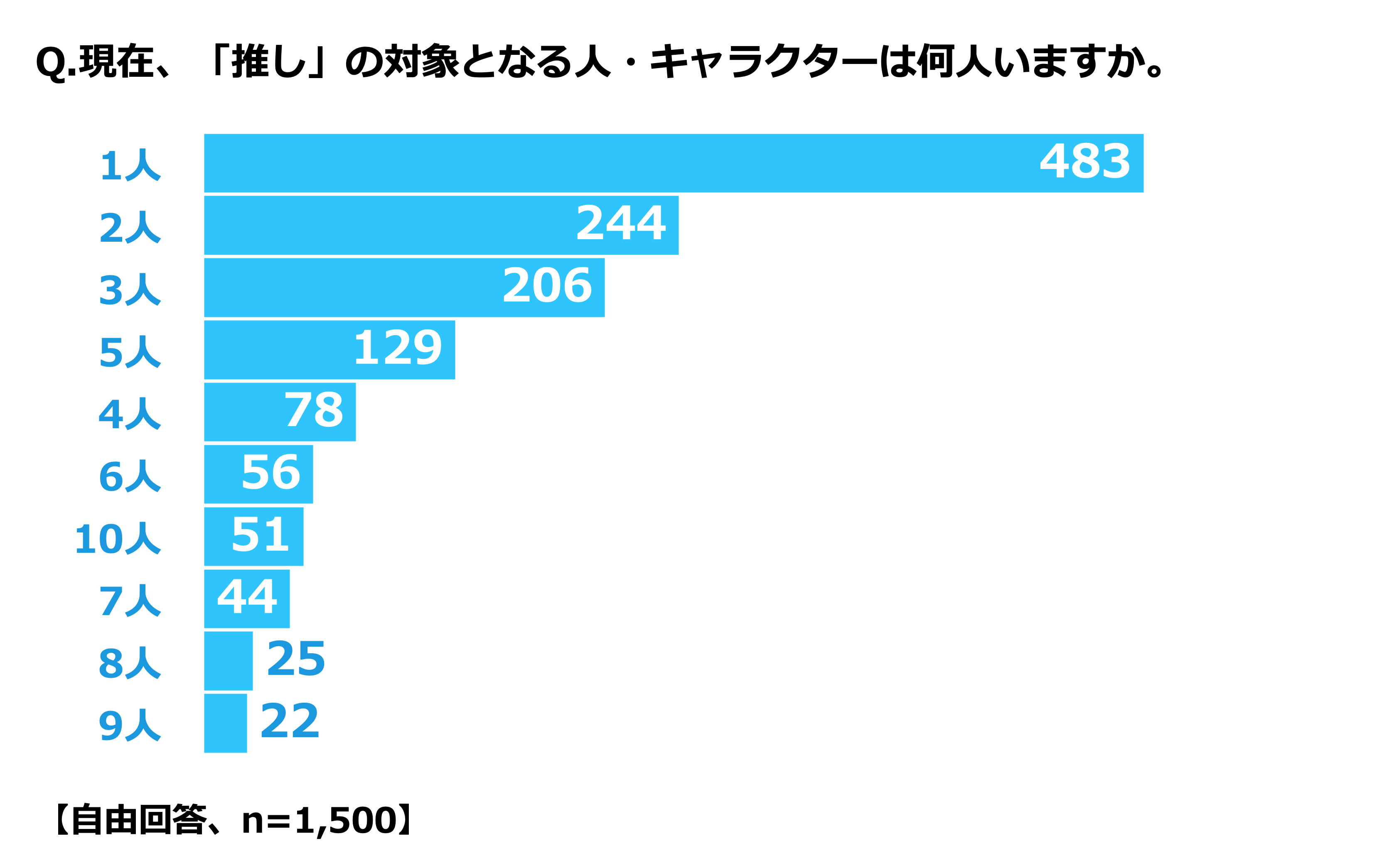 “推し数”をランキング形式で見ると、推しの対象が「1人」と回答した方が最も多い483名で1位に。以降は、2位「2人(244名)」、3位「3人(206名)」、4位「5人(129名)」、5位「4人(78名)」と、全体的には、推しの人数が少ない人の方が多い傾向にありますが、推しが「5人」いる人の割合は、意外にも「4人」いる人の割合を上回り、全体で4位に位置しています。