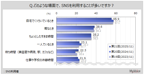 SNS利用者に、どのような場面でSNSを利用することが多いかを聞いたところ(複数回答)、「自宅でくつろいでいるとき」が55.9%、「暇なとき」「ちょっとしたすきま時間」が各30%台です。