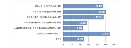 AI利用の効果(Q1×Q10):一方で、AIを頻繁に利用している人(217人)*2のうち、生成AIの進化は今後のキャリアに「新しいチャンスを生み出すと思う(希望)」と回答した人の割合は34.6%で、全く利用していない未経験者(16.4%)の約2.1倍と、大きな差がつきました。