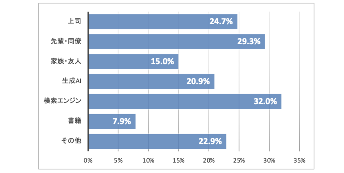 – 生成AIは協働者に?生成AIの利用領域が変化: 仕事で知識や情報不足に直面した際に「最初に頼るもの」として、「生成AI」(21%)が「上司」(25%)に迫る水準に。また、AIの利用領域は、定型業務(20%)だけでなく、専門的な問題解決(19%)やアイデア出し(13%)といった高度な業務にも拡大。