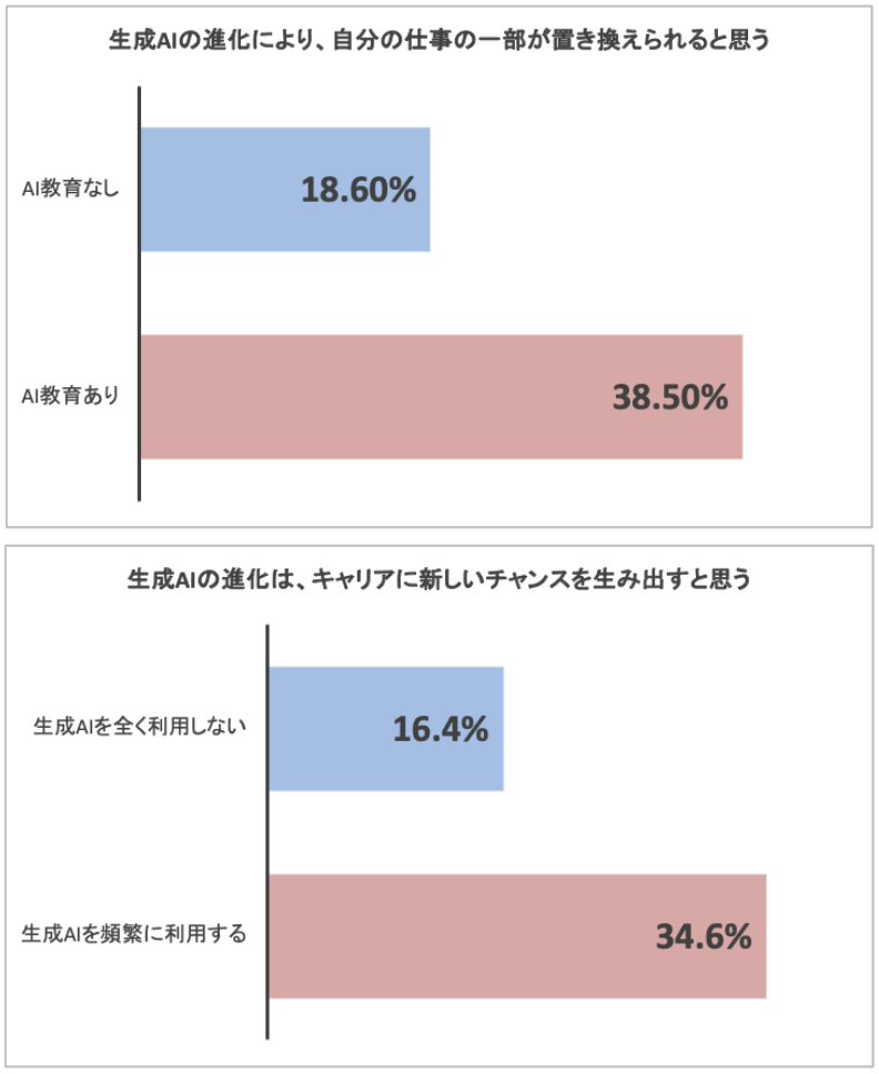 – 生成AIを利用することで将来への期待感が向上: 生成AI利用者の35%は「生成AIの進化が将来のキャリアに新たなチャンスを生み出す」と期待しており、未利用者の約2倍。一方、「生成AIについての教育」は、かえって不安を20ポイント増幅させているという結果となり、AIへの意識の変革には、形式的な情報提供だけでなく、実際の利用を促すような工夫が有効となりうると考えられる。(クロス集計)
