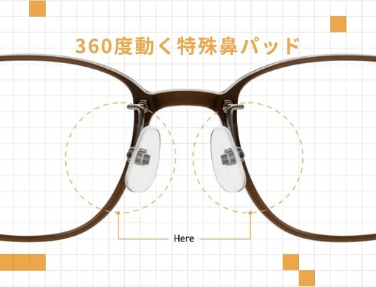 自然と顔にフィットする鼻パッド通常の約半分の軽さで、パッド面が360度どの角度にも曲がる特殊な鼻パッド「クビフリーパッド」を採用しています。かける人の鼻の形に合わせてフィットするため、鼻にやさしくなじみ、長時間かけても快適なかけ心地が続きます。
