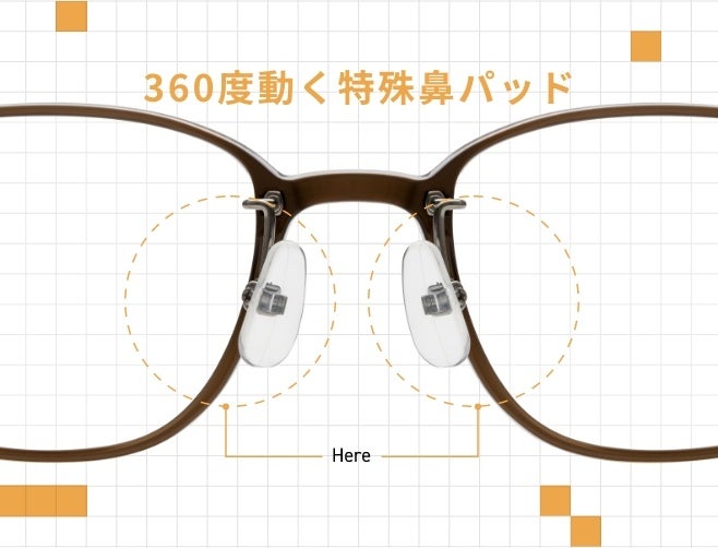 自然と顔にフィットする鼻パッド通常の約半分の軽さで、パッド面が360度どの角度にも曲がる特殊な鼻パッド「クビフリーパッド」を採用しています。かける人の鼻の形に合わせてフィットするため、鼻にやさしくなじみ、長時間かけても快適なかけ心地が続きます。