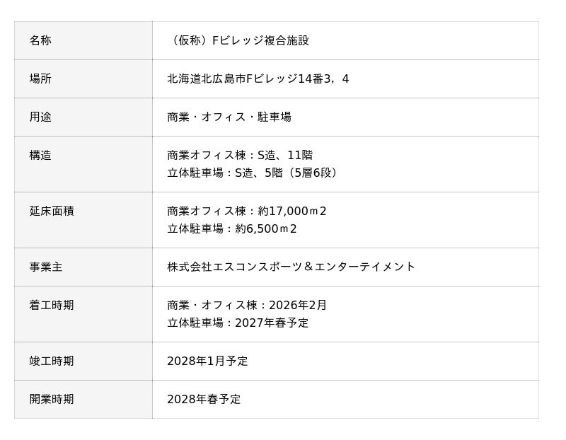 北海道ボールパークFビレッジ内に、新たに「商業・オフィス施設」を開発することが決定いたしましたので、お知らせいたします。本施設は、株式会社エスコンスポーツ&エンターテイメントが開発を手がけ、2028年春の開業を予定しています。計画地は、JR新駅と球場を結ぶペデストリアンデッキの中間に位置し、デッキから直接アクセス可能な利便性の高い立地です。Fビレッジ内では初となる賃貸オフィス施設の開発となり、スポーツ・エンターテイメントと近接する新たなワークプレイスとして、エリアのさらなる多様化と発展に寄与することが期待されます。Fビレッジは今後も、スポーツ・エンターテイメントを中核に、「職(オフィス)・住(住宅)・学(教育)・遊(エンタメ・商業)」が近接・融合するまちづくりを進めてまいります。