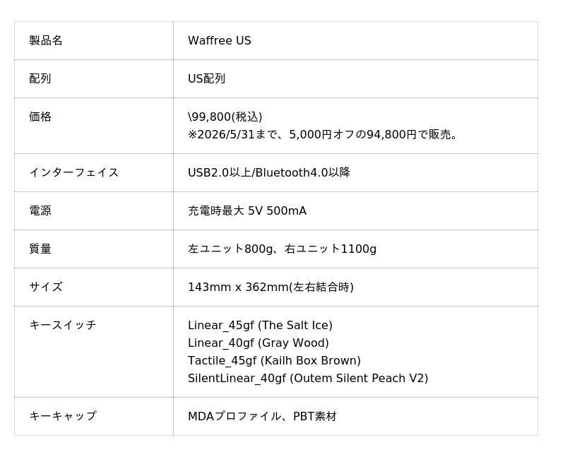Waffree USリリース記念として、2026/5/31まで、5,000円オフの94,800円で販売する。