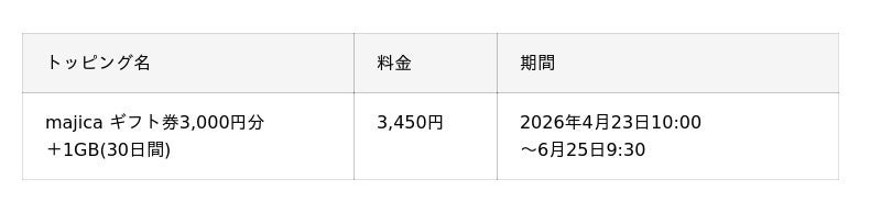 KDDI、沖縄セルラー、KDDI Digital Lifeは2026年4月23日から、povo2.0の「コラボトッピング」として、総合ディスカウントストア「ドン・キホーテ」で利用できる「majica ギフト券3,000円分」と、「1GB(30日間)」がセットになったトッピングを3,450円で提供します。