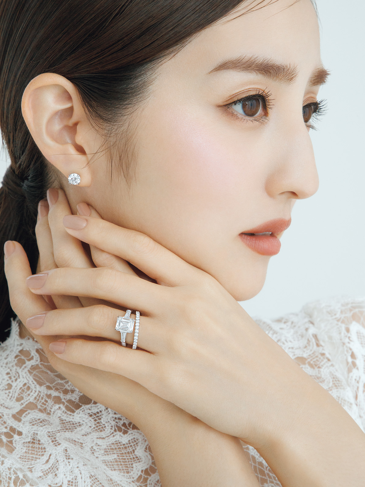 Akane_リング「トリスト・ワンロウ・バンドリング」〈Pt×D〉¥671,000~ 「リリークラスター・ミニ・イヤスタッズ」〈Pt×D〉¥1,364,000 Men’s_リング「スリーストーン・バンドリング」〈Pt×D〉¥506,000~(すべてハリー・ウィンストン/ハリー・ウィンストン クライアントインフォメーション) [衣装]Akane_プルオーバー¥12,100(ステートオブマインド/ゲストリスト)シャツ(スタイリスト私物)Men’s_シャツ¥30,800カーディガン¥39,600(ともにスローン/ザ ショップ スローン 自由が丘)