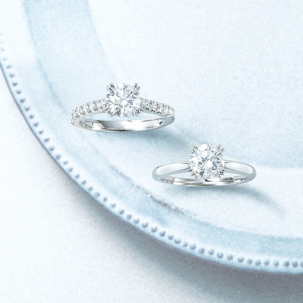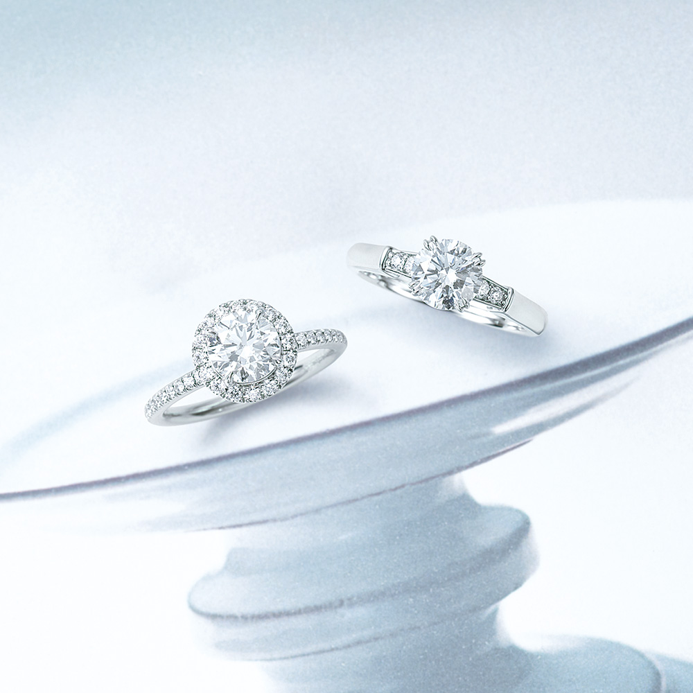 「ブリリアント・ラブ・エンゲージメントリング」〈Pt×Dセンター0.50ct~〉¥1,804,000~ 右_ダイヤモンドリングのお手本とも言うべき、ストイックかつタイムレスなデザイン。ダイヤモンド本来の美しさと輝きが最大限引き出された、時代を超えて愛されるオーセンティックな魅力が。「ラウンドカット・ソリティア・リング」〈Pt×D0.50ct~〉¥1,221,000~
