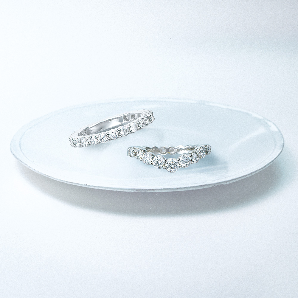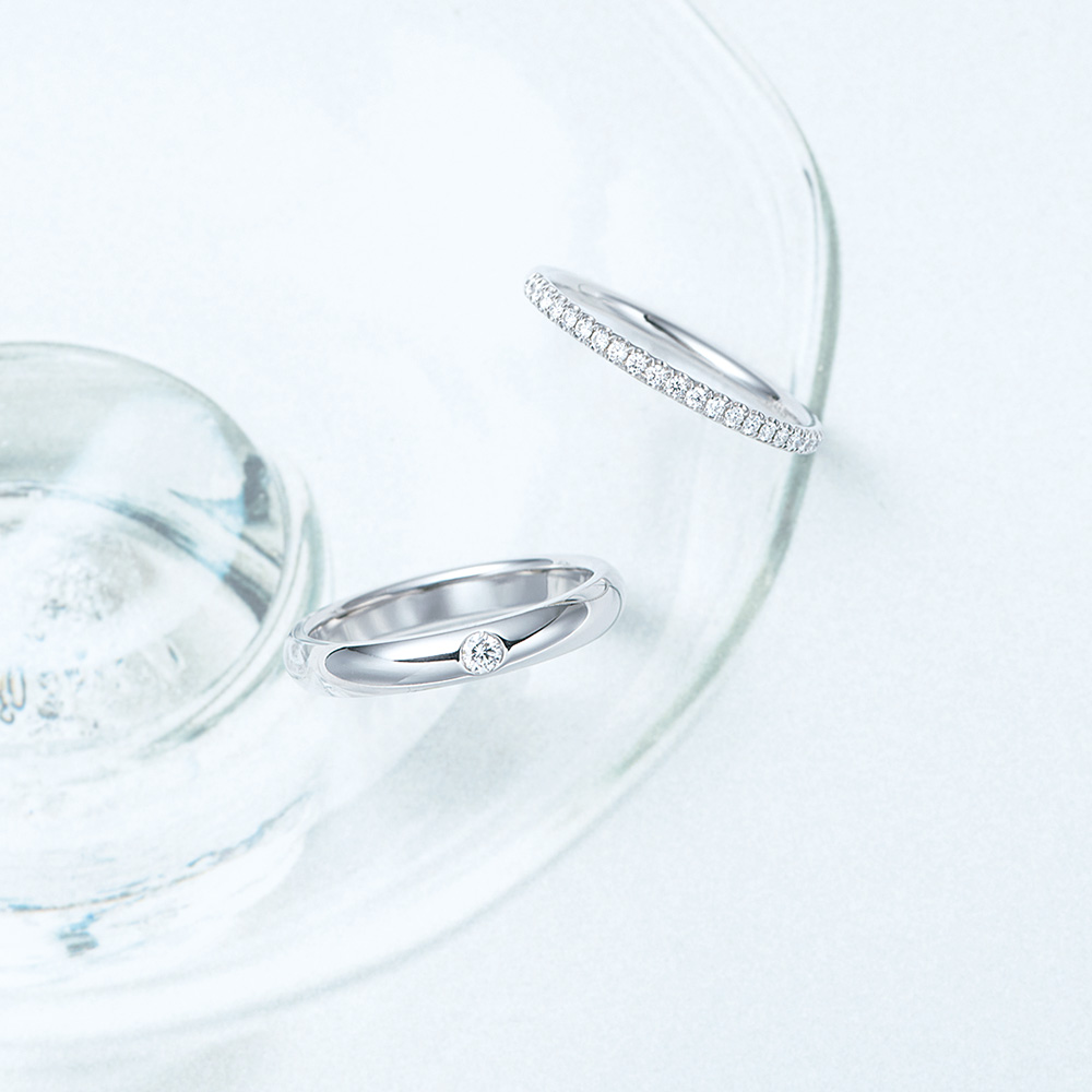「マイクロパヴェ・バンドリング」〈Pt×D〉¥627,000~ 左_プラチナ製のバンドリングに、密かに輝く1石のラウンドカット・ダイヤモンドがアクセント。控えめながらも確かな輝きが、品格とエターナルな魅力を放つデザインです。「ラウンドカット・マリッジリング」〈Pt×D〉¥407,000~