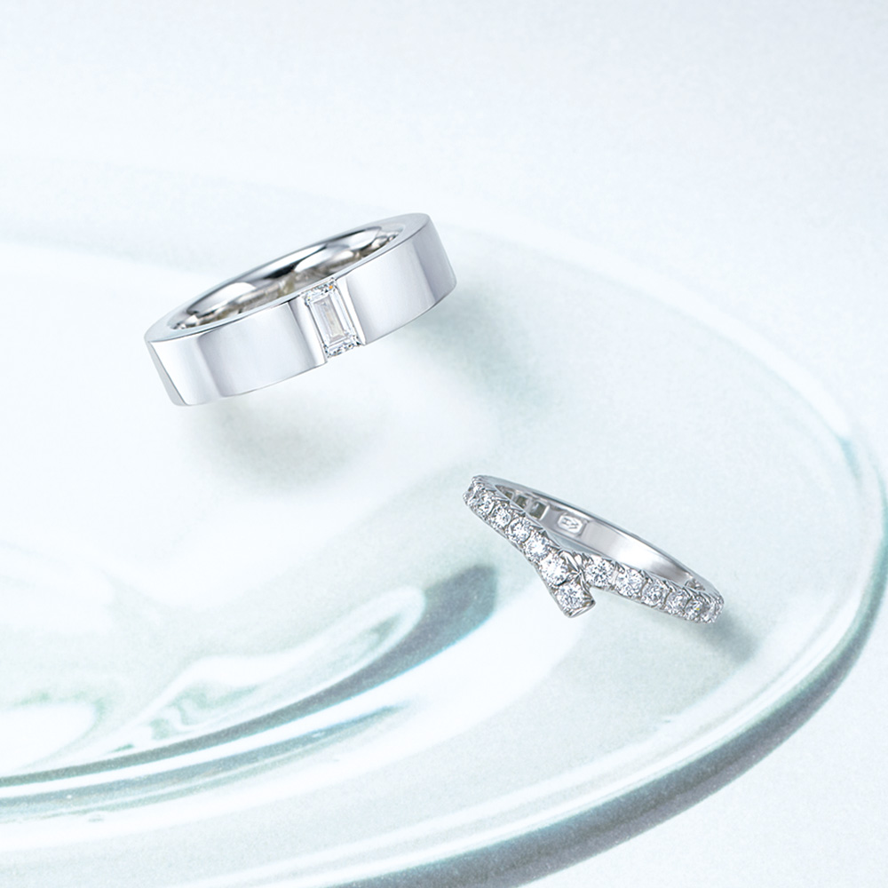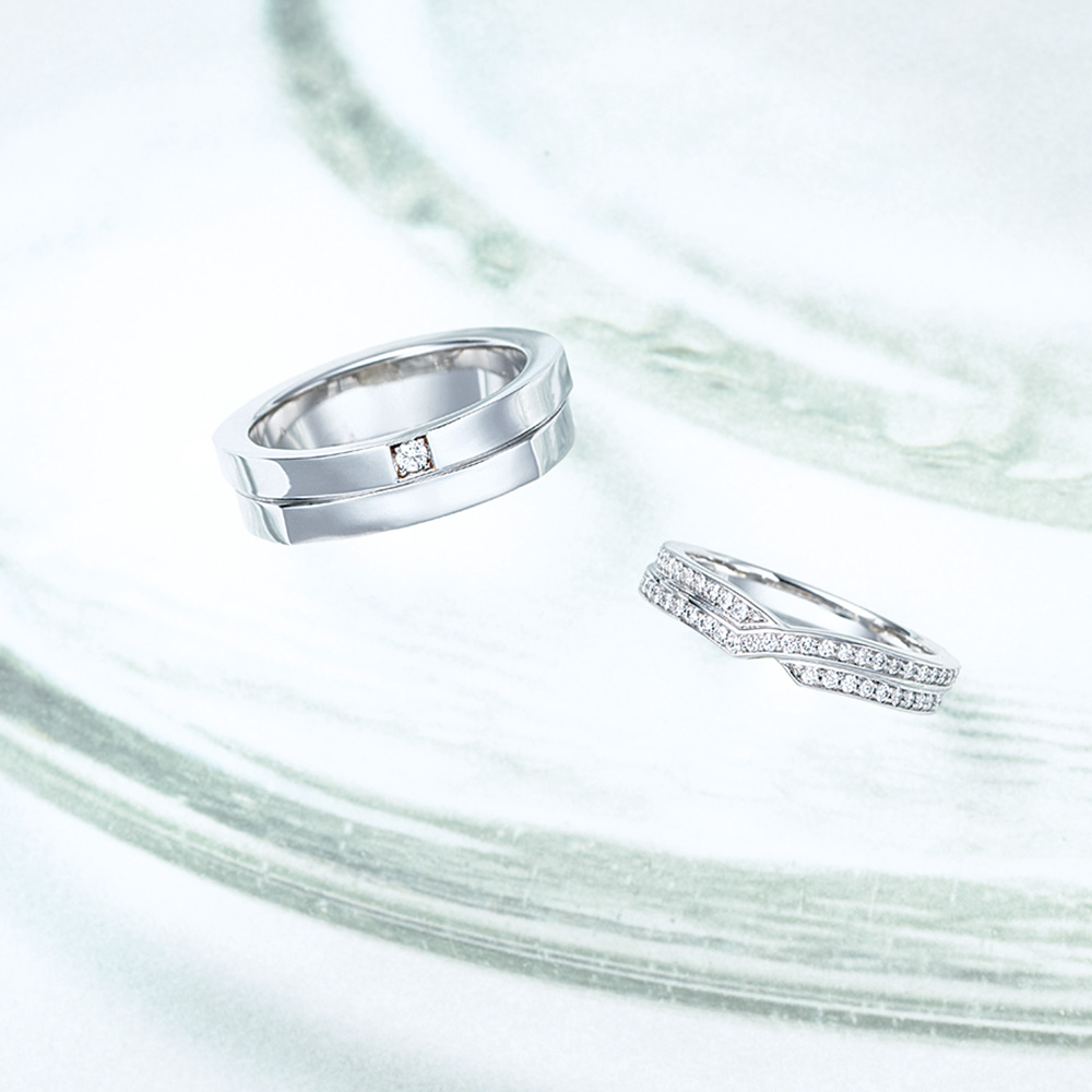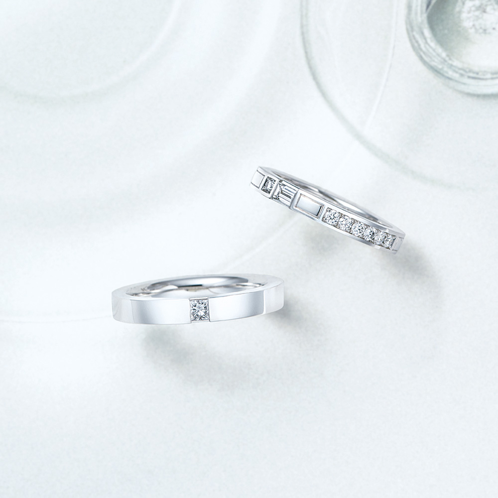 「トラフィック・アクセント・バンドリング」〈Pt×D〉¥682,000~ 下_エッジが際立つプラチナにプリンセスカット・ダイヤモンドをセッティング。シャープでストイックなリングが、彼の人生に寄り添います。「プリンセスカット・マリッジリング」〈Pt×D〉¥517,000~