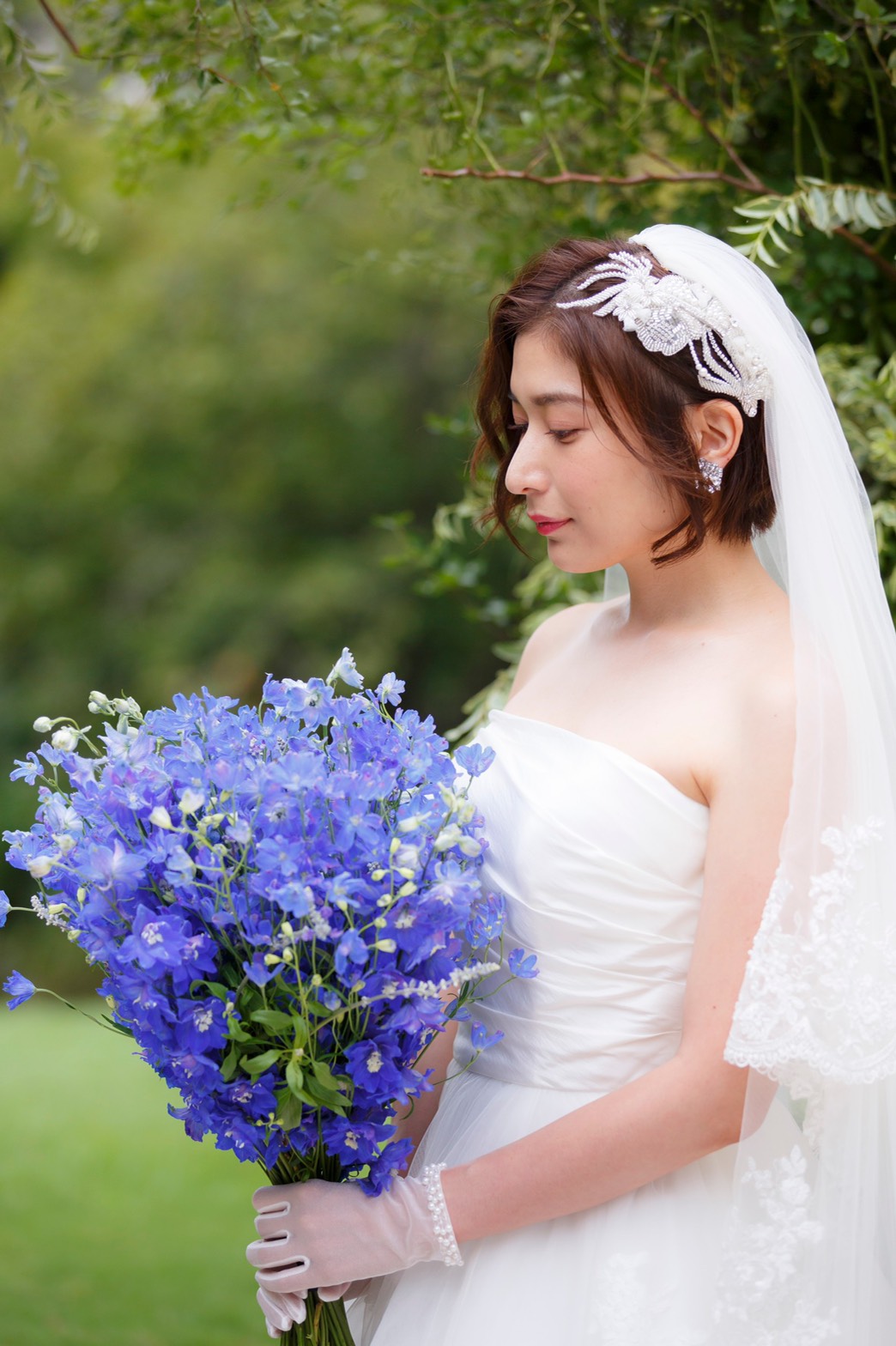 コーディネート全体を引き立ててくれたのが、このデルフィニウムのブーケ。甘くなりすぎないように、大好きなブルーカラーを選びました。またデルフィニウムの花言葉は、「清明」と「あなたは幸福をふりまく」。清く美しい花嫁にぴったりです。サムシングブルーの意味も込められています。