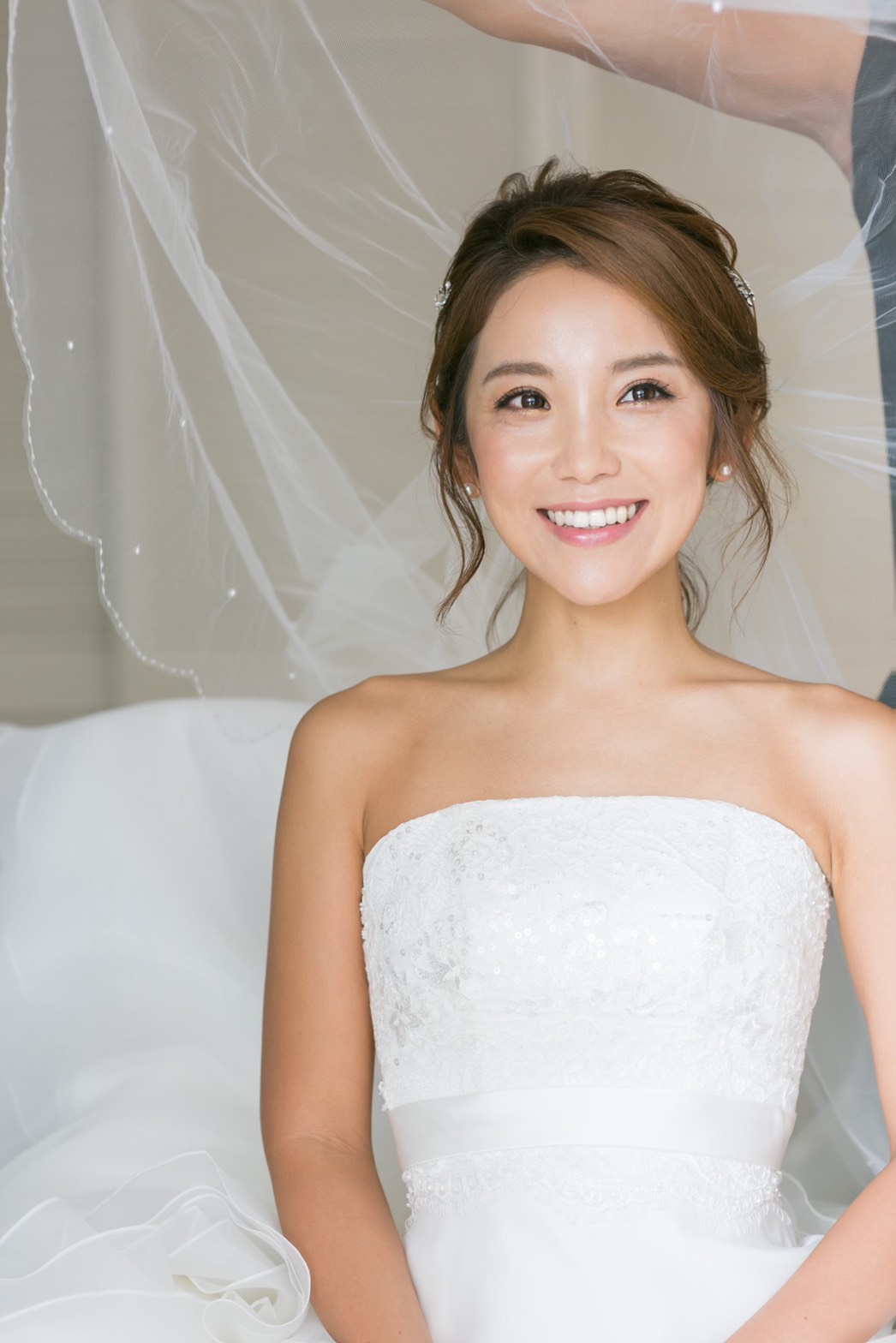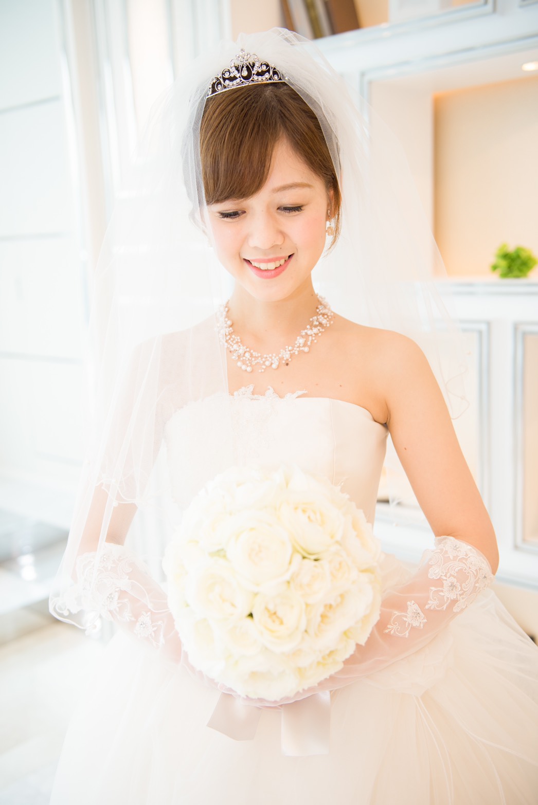 白い肌と優しい顔立ちにぴったりの、フェミニンなムードが漂うコーディネート。これぞ花嫁さん!といった憧れの王道スタイルです。ティアラ、繊細なチュールのドレスとヴェール、真っ白なブーケ、、思わずうっとりとしてしまいます。甘口がお好きなプレ花嫁さんにオススメです。(小川奈々絵さん/メーカー勤務・30歳 164cm @nanae67742240)