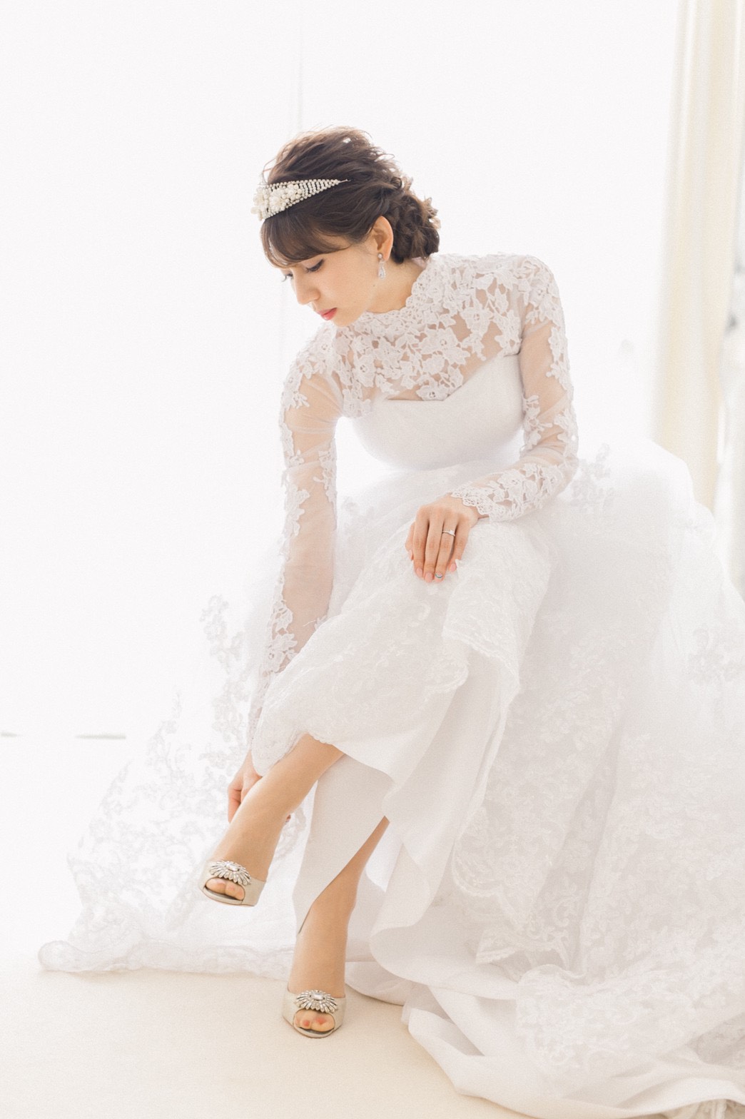 ウェディングドレスでは、海外の王室のような厳かな雰囲気を演出して、王道のウェディングスタイルに。ヘアはアップにしてティアラを着用し、品性漂うシンプルなムードを意識しました。
