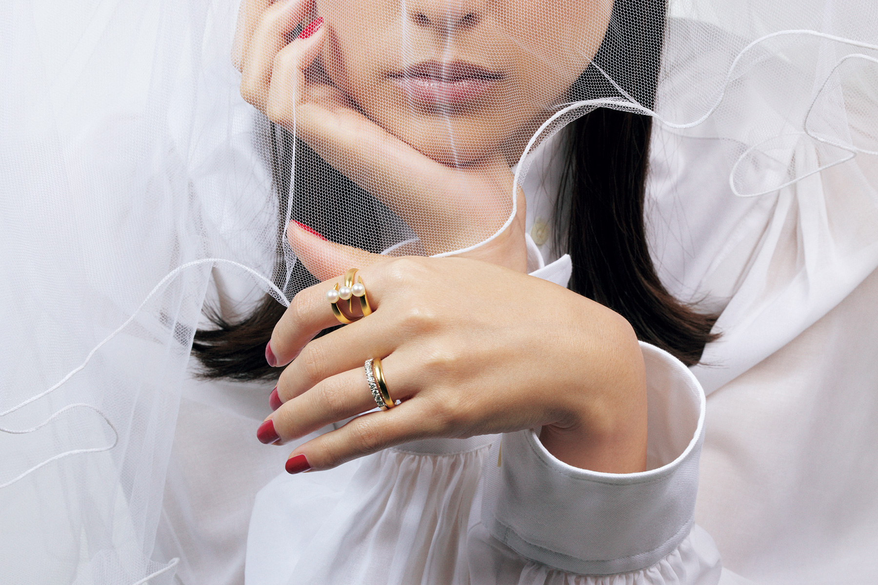 ソリテールにこだわらない自由な発想。馴染みやすいのにラグジュアリー、TPOを問わず自信をくれる手元になりそう。インパクトのある「デインジャー」シリーズとの相性も完璧です。普段着からドレスまで、幅広い着こなしにマッチ。薬指上から「ブリッランテ ハーフエタニティ」〈Pt×D〉¥482,900「ピアチェーレ」〈YG〉¥88,000人差し指「デインジャーファング」〈YG×あこや真珠〉¥345,400(すべてTASAKI)シャツ¥27,500(ハイク/ボウルズ)ヴェール/私物