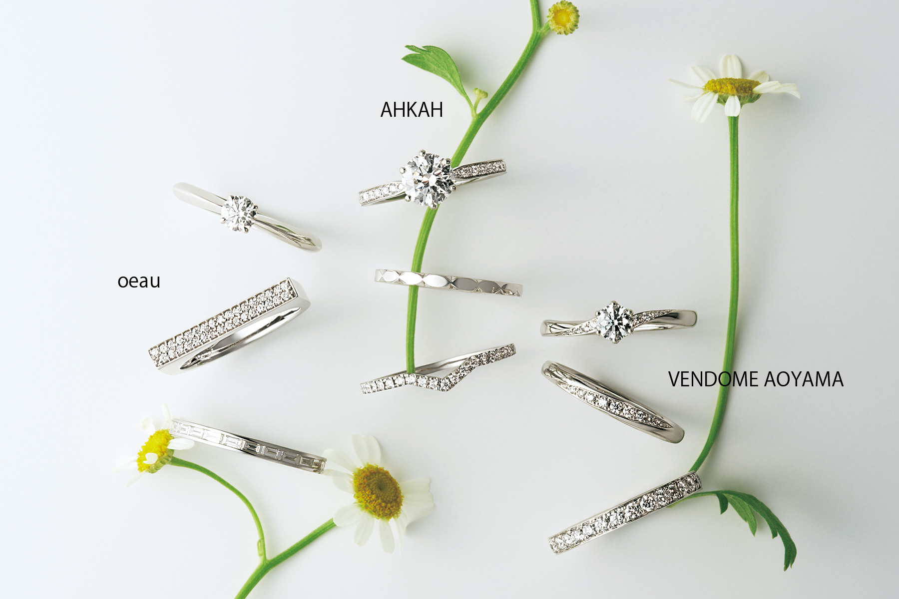 【VENDOME AOYAMA】立体的なウェーブラインに、グラデーションを思わせるメレダイヤモンドをあしらって。羨望のフルエタニティリングもファッション感覚で取り入れたい。リング上から〈Pt×Dセンター0.15ct~〉¥253,000~〈Pt×D〉¥143,000〈Pt×D〉¥374,000(すべてヴァンドーム青山/ヴァンドーム青山プルミエール伊勢丹新宿店)【AHKAH】アームや石座をすっきりさせたデザインは、手元にリズムが生まれるラインワークやV字など、表情豊かなマリッジリングがお似合いです。リング上から〈Pt×Dセンター0.2ct~〉¥341,000〈Pt〉¥94,600〈Pt×D〉¥157,300(すべてアーカーブライダル/アーカー表参道ヒルズ店)【oeau】ベーシックなソリテールリングを選んだら、さりげなく個性を発揮するスクエアのバーリングや、長方形を形どったバケットダイヤモンドとの組み合わせがおすすめ。リング〈K18WG×D〉上から¥451,000¥247,500¥429,000(すべてオー/ハルミ ショールーム)