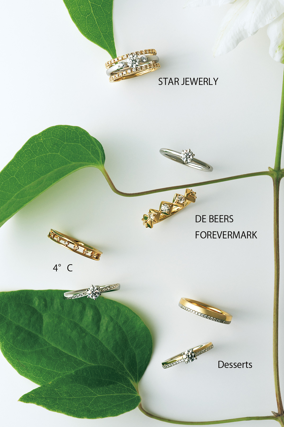 【STAR JEWELRY】2連風のリングの間にソリテールリングを。私だけのデザインを作るスタッキングの醍醐味。リング「サンシャイン オブ ライフ」〈Pt×D0.2ct~〉¥303,600~リング「リングエンハンサー」〈YG×D〉¥176,000(ともにスタージュエリー/スタージュエリー銀座店)【DE BEERS FOREVERMARK】夜空に輝く星を表現し、ダイヤモンドの輪郭を描き出す「アイコン」コレクション。上「フォーエバーマーク アイコン® コレクション」シックス プロングス ソリティア リング」〈Pt×D0.25ct~〉¥379,500~下「フォーエバーマーク アイコン®コレクション 5ストーン リング」〈YG×D〉¥297,000(ともにデビアスフォーエバーマーク)【4℃】エンゲージはシンプル、マリッジに遊び心を。リング上〈YG×D〉¥68,200下〈Pt×D〉¥363,000(ともに4℃/エフ・ディ・シィ・プロダクツ)【Desserts】シンプルだけどふたりらしい、ユニセックスなデザイン。リング「オランジェット」上〈Pt×YG×D〉¥243,100下〈Pt×YG×D〉¥308,500(ともにビジュピコ/ビジュピコ ブライダル上野御徒町本店)