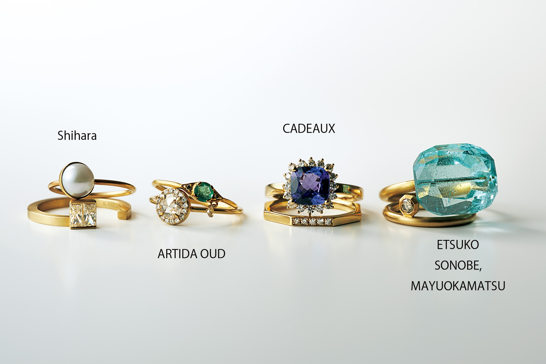 【ETSUKO SONOBE・MAYUOKAMATSU】天然石の魅力を最大限に引き出すカボションリング。八角形のフェイスを持つ、ダイヤモンドのエンゲージメントリングと、個性を引き出し合うコーディネート。リング〈YG×アクアマリン〉¥308,000〈エツコソノベ〉リング〈YG×D〉¥209,000〈マユオカマツ〉(ともにバーニーズ ニューヨークカスタマーセンター)【CADEAUX】色石好きにファンの多いカドー。直感はもちろん、誕生石を選ぶとより愛着も湧くはず。リング上〈K18YG×タンザナイト×D〉¥655,000〈K18YG×D〉¥129,000(ともにカドー/カドー伊勢丹新宿店本館1F)【ARTIDA OUD】どことなく有機的なフォルムと、柔らかなアンティーク調の風合いが魅力。上〈K10YG×K18YGプレーティング×エメラルド×D〉¥39,600下〈K18×K18YGプレーティング×D〉¥187,000(ともにアルティーダ ウード)【Shihara】コンテンポラリーな雰囲気のマットテクスチャー。空間を持たせたプリンセスカットのダイヤモンドリングと、多彩なレイヤードを満喫したい。リング上〈YG×アコヤパール〉¥88,000下〈YG×D〉¥951,500(ともにシハラ/シハラ ラボ)