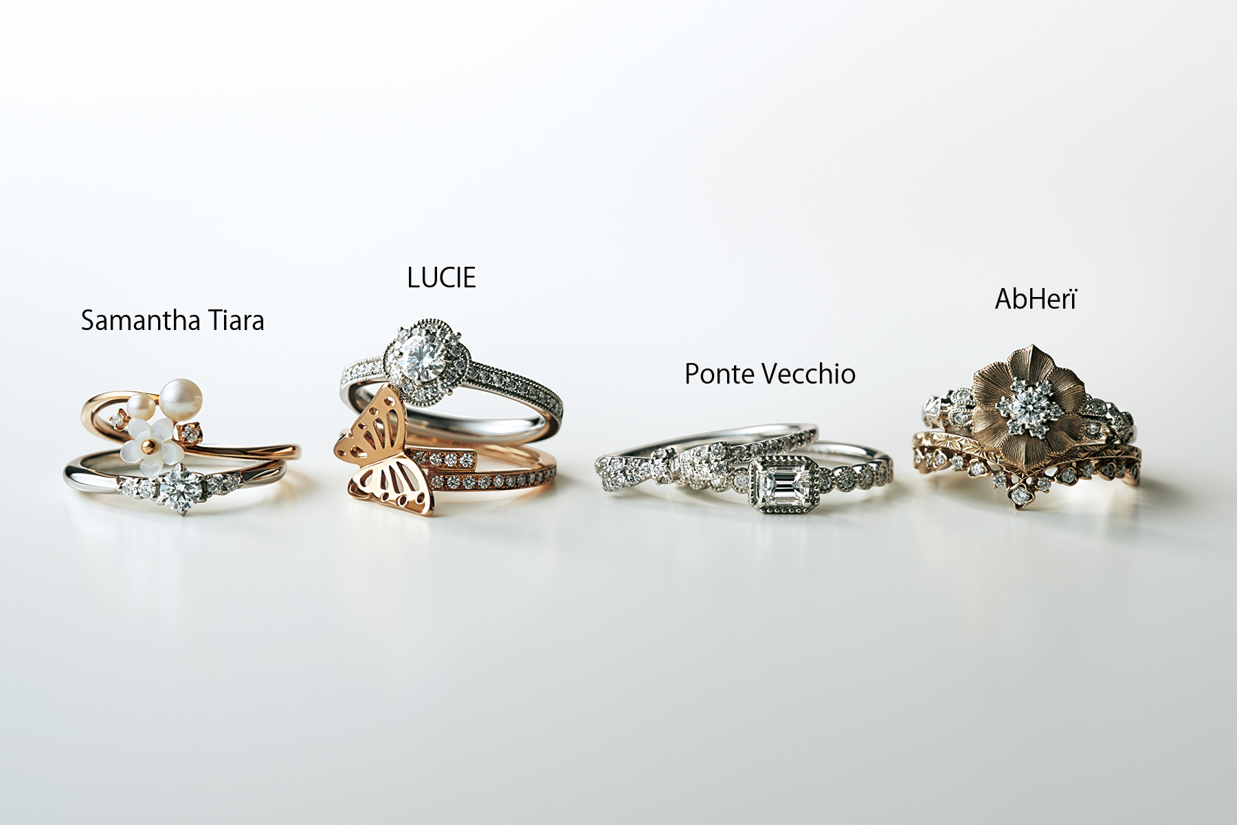 【AbHerï】純白のガーデニアがモチーフのフラワーリングに、レースにインスパイアされたV字リングを重ねて。上〈Pt×シャンパンゴールド×D〉¥352,000下〈シャンパンゴールド×D〉¥220,000(ともにアベリ)【Ponte Vecchio】エメラルドカットのエンゲージメントリング。ふたりの縁を結ぶリボンモチーフと、ロマンティックなムード。リング上〈WG×D〉¥140,800下〈Pt×D〉¥330,000※ダイヤモンドのグレードにより変動します(ともにポンテヴェキオ/ポンテ ヴェキオ ブライダル銀座並木通り本店)【LUCIE】美しい薔薇に引き寄せられたバタフライ。モチーフ同士の関連性を、自分だけのストーリーに。リング上「フォレ」〈Pt×Dセンター0.2ct~〉¥354,200~下「パピヨン」〈PG×D〉¥113,300(ともにルシエ/ルシエ 銀座本店)【Samantha Tiara】清廉なパールと、シェルのフラワーモチーフが可憐さを引き立てて。パールのリング上〈YG×シェル×淡水パール×D〉¥36,300下〈Pt×D〉¥198,000(ともにサマンサティアラ/サマンサティアラ新宿タカシマヤ店)