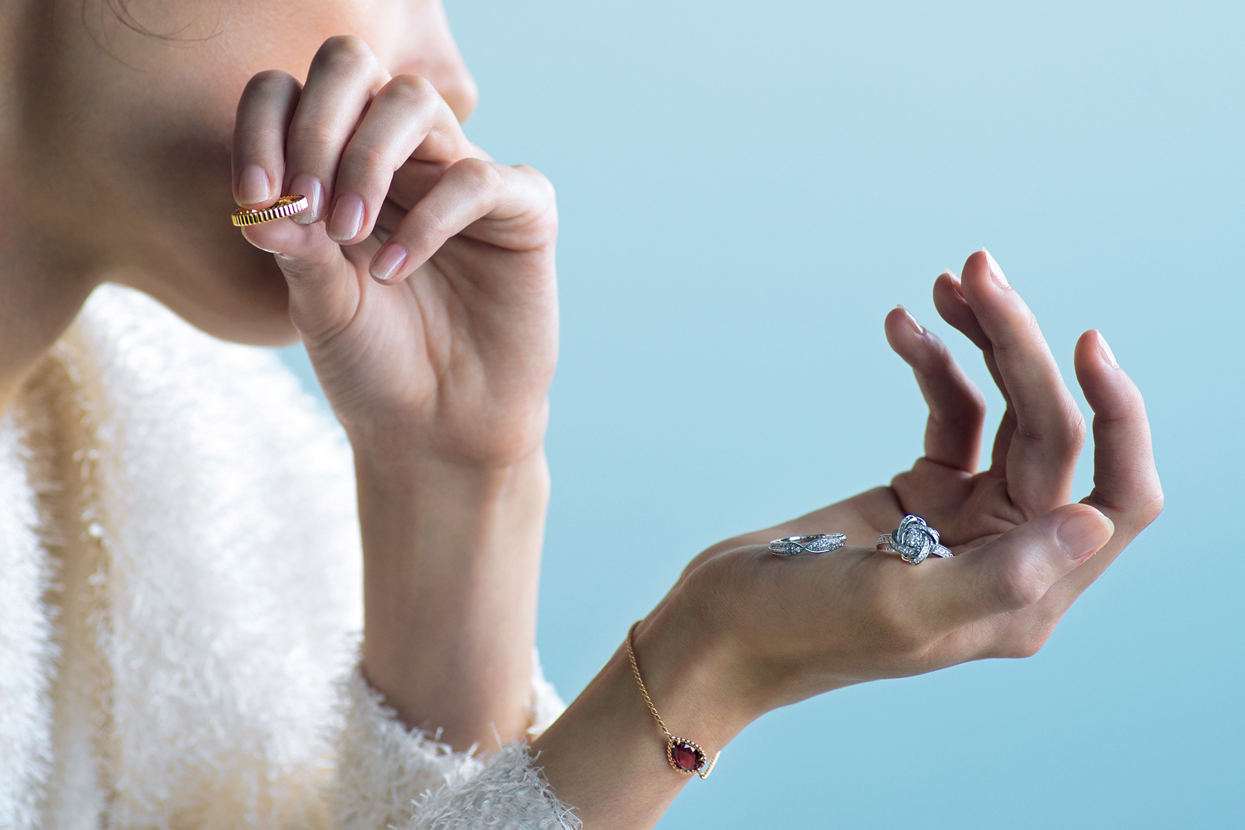色石も投入した、プラスオンプラスのコーディネート。手のひらのリング・右「ピヴォワンヌ」〈WG×Dセンター0.2ct~〉¥830,500~左「ポン ドゥ パリ」〈Pt×D〉¥478,500ブレスレット「セルパンボエム」〈PG×ロードライトガーネット〉¥305,800手に持った男性マリッジ「キャトル グログラン」〈YG〉¥207,900(すべてブシュロン/ブシュロン クライアントサービス)トップス¥24,200(ツル バイ マリコ オイカワ)