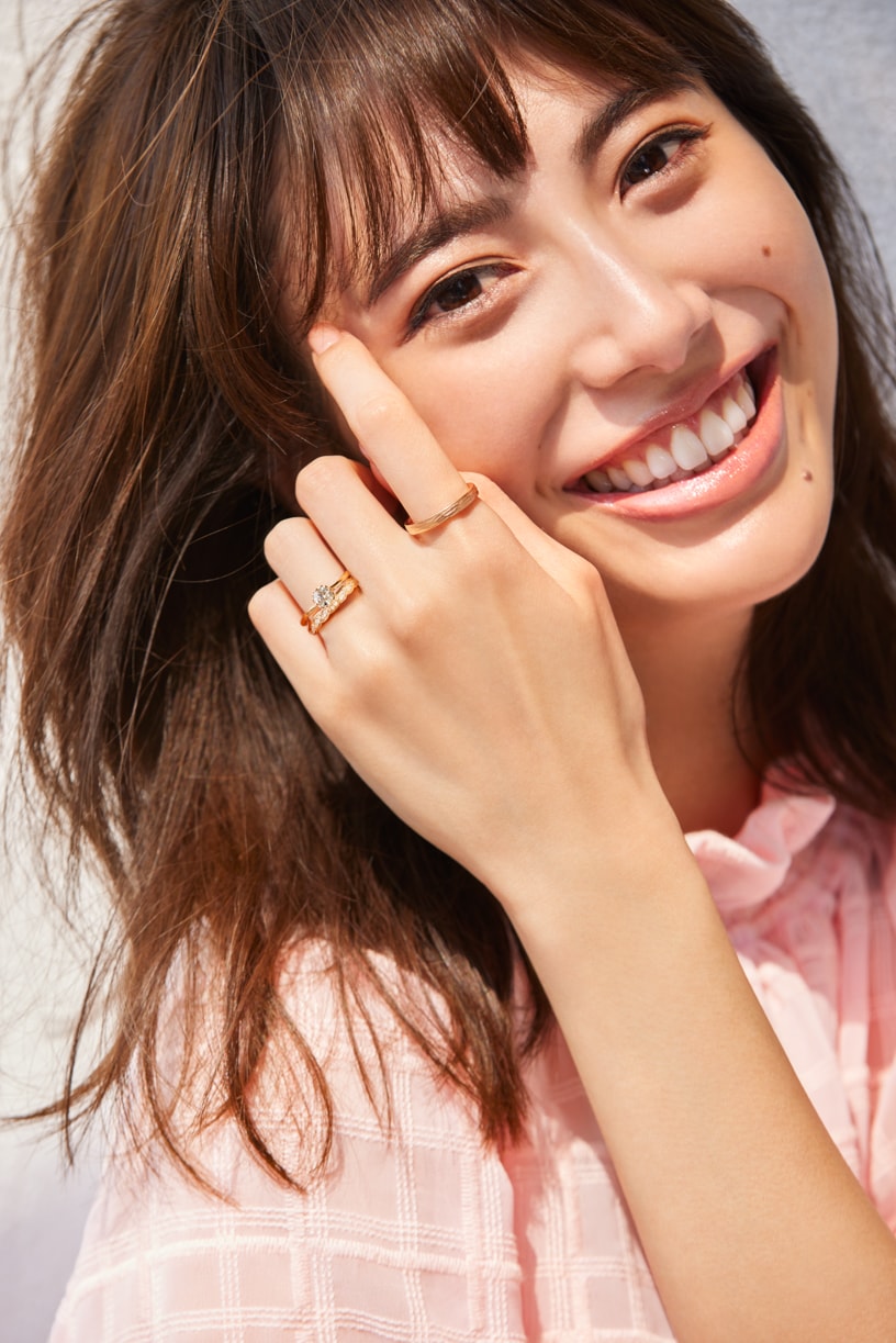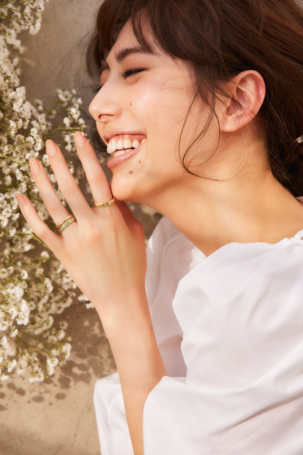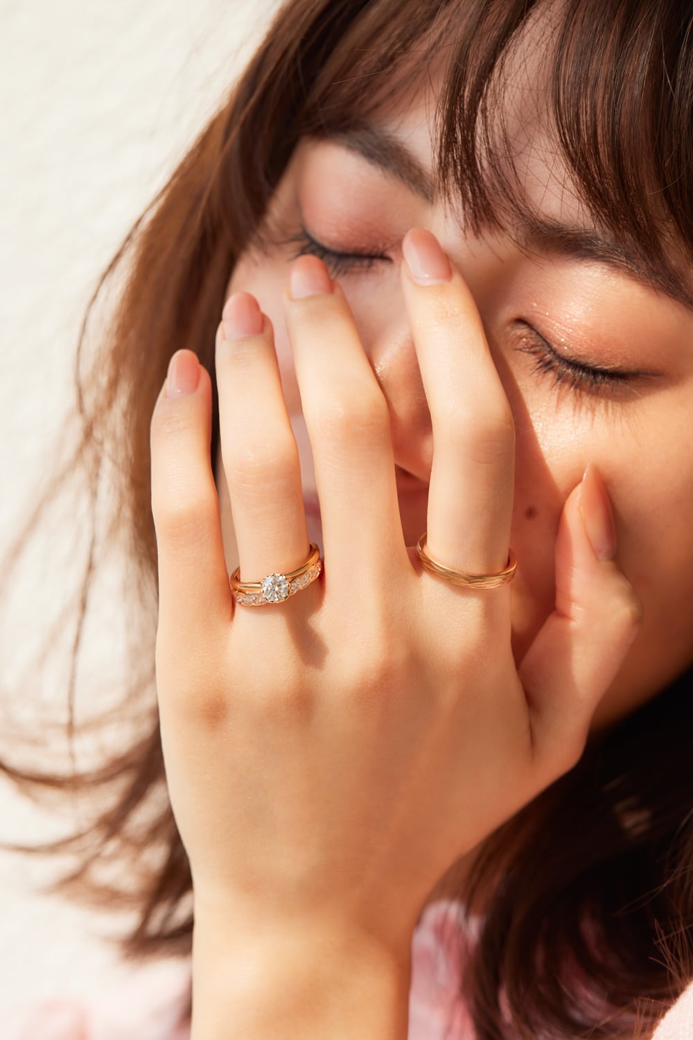 [薬指]エンゲージリングに、“約束”や“幸福”の花言葉を持つシロツメクサの花冠をイメージしたエタニティリングを重ねて、華やかに。可憐かつ上品な存在感が、フェミニン派のムードとよく似合う。