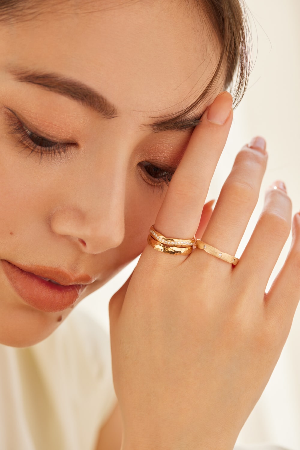 [人差し指]樹木の幹からインスピレーションを得たネイチャー仕上げのリング。2人の愛の強さを表したようなリングが、目に入るたびに幸福感を与えてくれそう。シンプルなシルエットなので、レイヤードも楽しみやすい。
