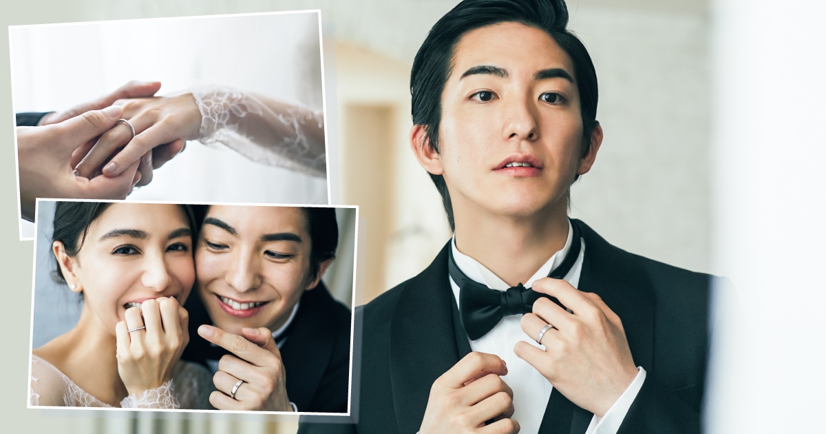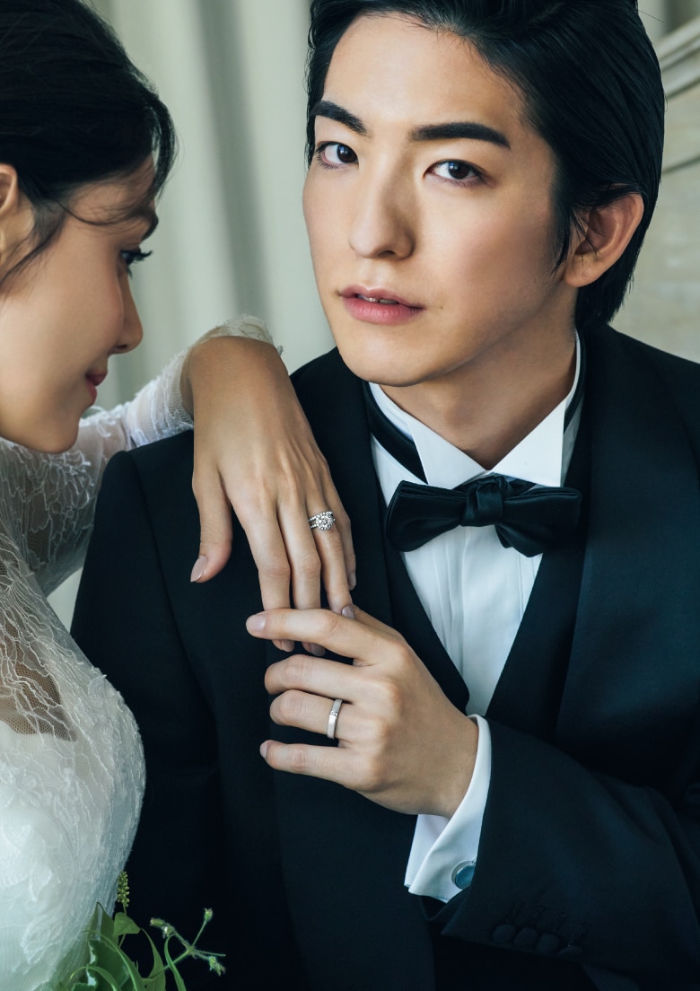 [Ana Clara]マリッジリング「マイクロパヴェ・バンドリング」〈Pt×D〉¥627,000~ ピアス「ラウンドカット・イヤスタッズ」〈Pt×D0.4ct〜〉¥1,661,000〜(ともにハリー・ウィンストン/ハリー・ウィンストン クライアントインフォメーション)ドレス ¥429,000※レンタル価格(イネス・ディ・サント/ミラー ミラー 丸の内)その他/スタイリスト私物[Gouki]リング「スリーストーン・バンドリング」〈Pt×D〉¥506,000~(ハリー・ウィンストン/ハリー・ウィンストン クライアントインフォメーション)タキシード ¥154,000※レンタル価格(ミラー ミラー/ミラー ミラー 丸の内)