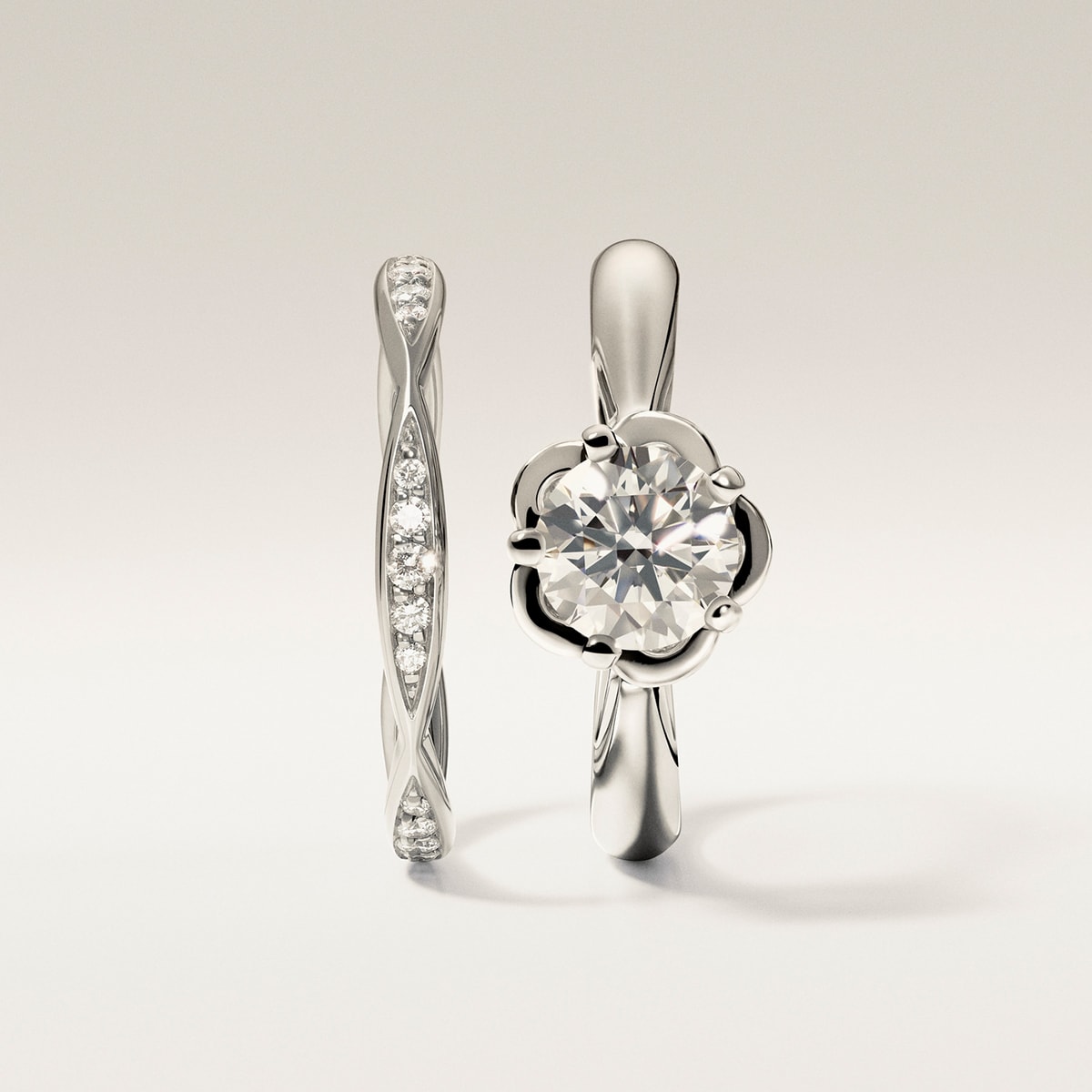 〈左〉「カメリア コレクション」エタニティ リング \512,600 〈右〉「カメリア コレクション」エンゲージメント リング 0.25ct〜 \668,800~