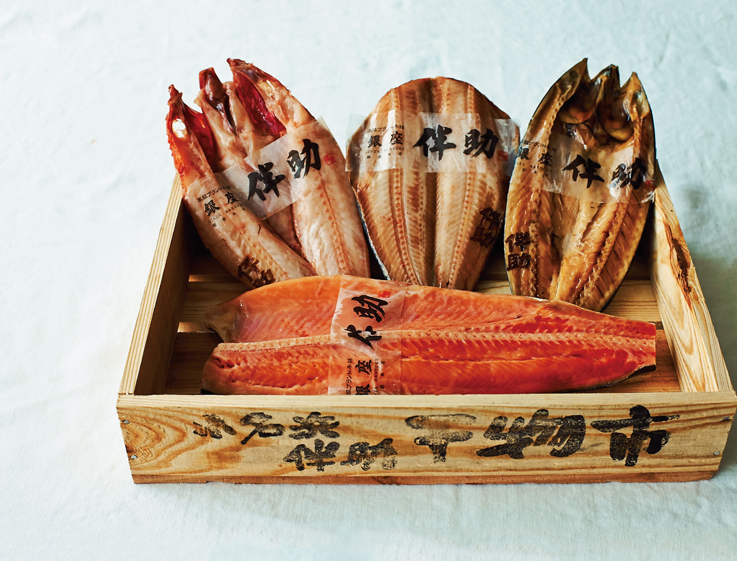 編集長が愛する干物屋・銀座伴助の木箱入り詰め合わせ。この干物たち、実は顔よりも大きいサイズなんです。包みを開けるゲストにとって、きっとサプライズになるはずです。