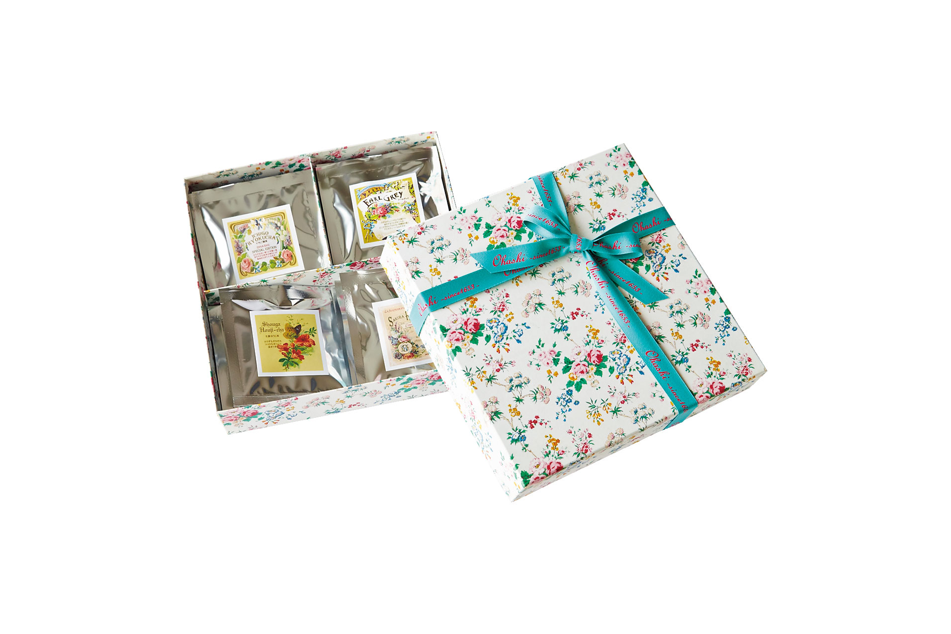 16種類のティーパックと4種の葛湯のセットです。木苺、栗、さくらなど、花柄の包装紙が作るイメージを崩さない、童話に出てきそうな植物のフレーバーが詰まっています。