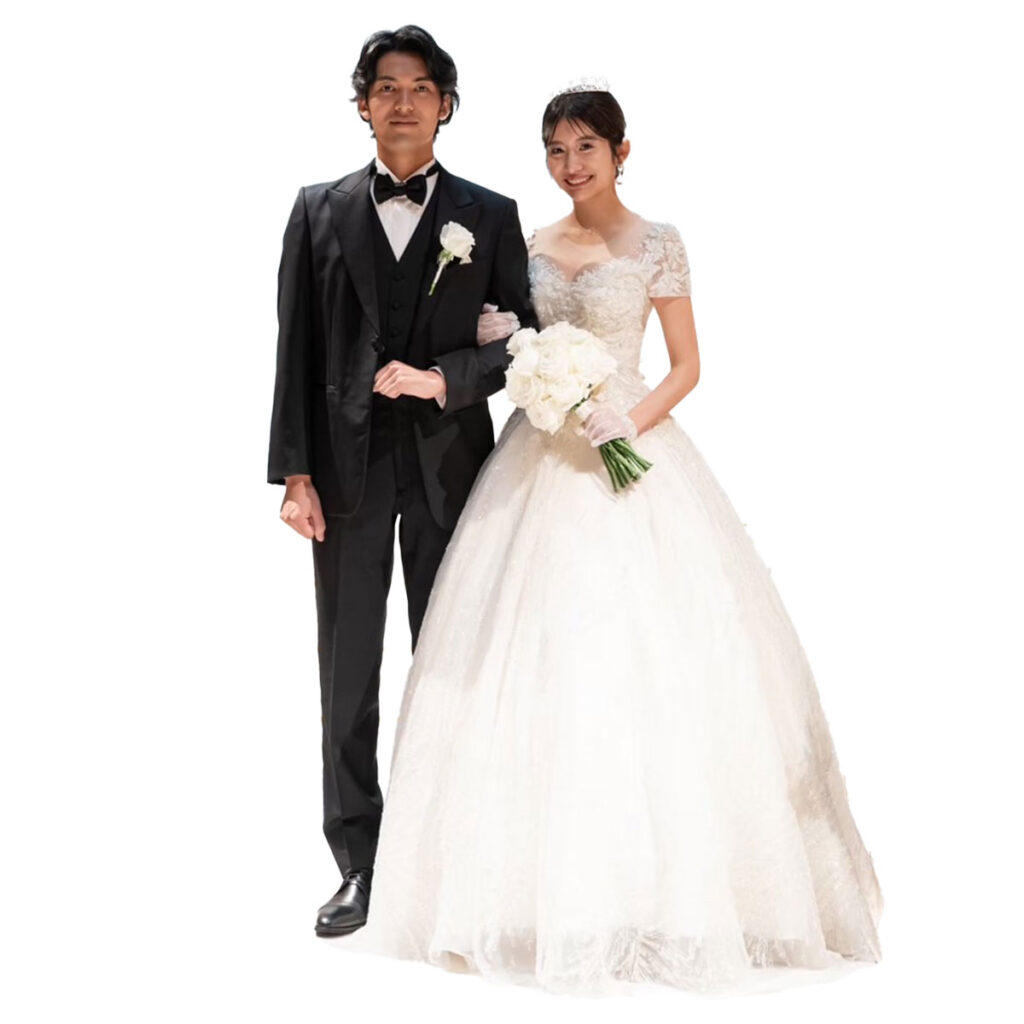 「披露宴のテーマは『唯一無二』。ウェディングドレスにもオリジナリティを出したくて、セミオーダーメイドで作成しました。シルクサテンオーガンジーの生地を重ねて、透け感を出しつつ、ビッグボリュームで華やかに。世界に一つだけの、こだわりが詰まった存在感のあるプリンセスドレスに仕上げていただきました」宇川美有紀さん(31歳・メーカー)