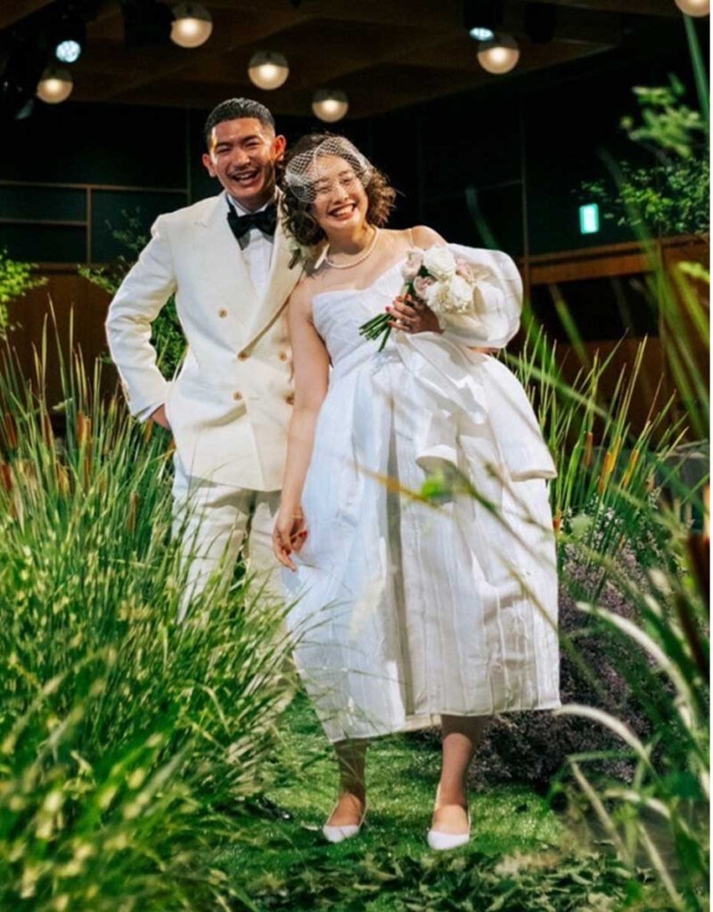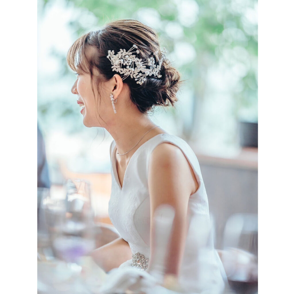 「セシリー・バンセンのドレスワンピとジャケットをデンマークからオーダーしました。入場時はワンピースのみ、再入場時にはジャケットを羽織ってお色直し風に。安くはありませんが式後も私服として愛用できるので、長く使える点ではドレスをレンタルするよりお得だと思います」橘 彩さん(30歳・スタイリスト/PR)