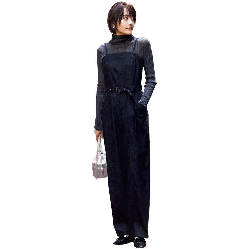 ニット¥15,950(アンクレイヴ ホワイト/オンワード樫山)コンビネゾン¥46,200(アルアバイル)イヤリング¥2,640(リミテッド ナンバー/お世話や)バングル¥62,700(マリハ)バッグ¥130,900(J&M デヴィッドソン/J&M デヴィッドソン カスタマーセンター)シューズ¥79,200(ペリーコ/トゥモローランド)[彼ママ]トップス¥23,100 デニム¥20,900(ともにアンタイトル)