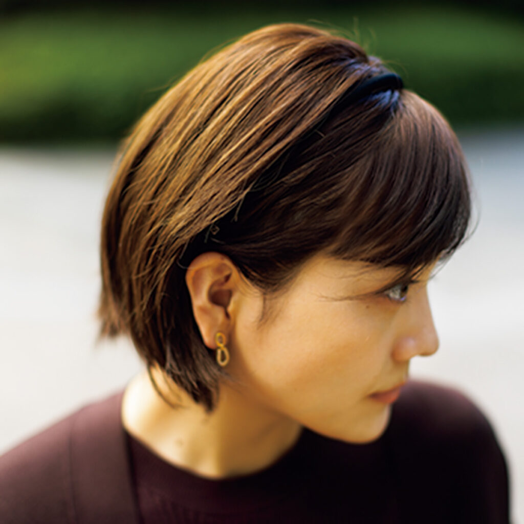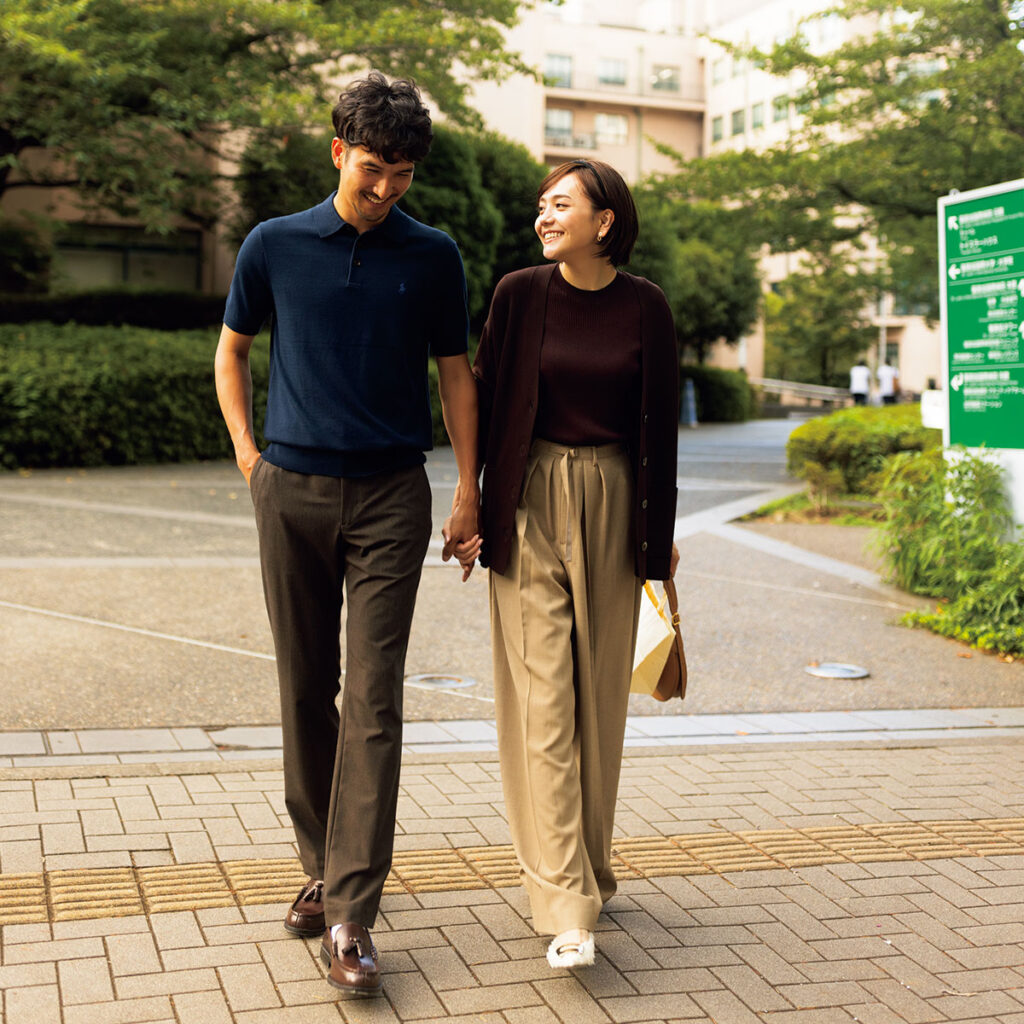 ニット¥12,100(ルーニィ)カーディガン¥25,300(ユナイテッド アローズ/ユナイテッド アローズ 六本木ヒルズ店)パンツ¥29,700(アルアバイル)カチューシャ¥15,400(アレクサンドル ドゥ パリ/アレクサンドル ドゥ パリ GINZA SIX店)イヤリング¥173,800(ヴァンドーム青山/ヴァンドーム青山 プルミエール 伊勢丹新宿店)バッグ¥86,900(ポロ ラルフ ローレン/ラルフ ローレン)シューズ¥79,200(ペリーコ/アマン)[彼]ポロシャツ¥24,200 パンツ¥31,900(ともにポロ ラルフローレン/ポロ ラルフ ローレン)ローファー¥12,100(HARUTA)